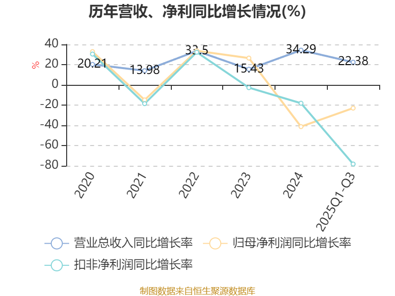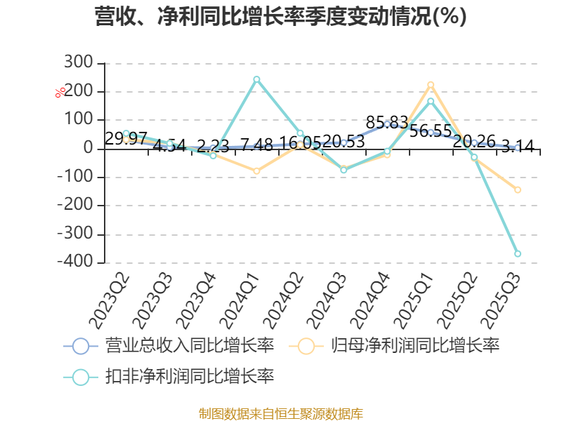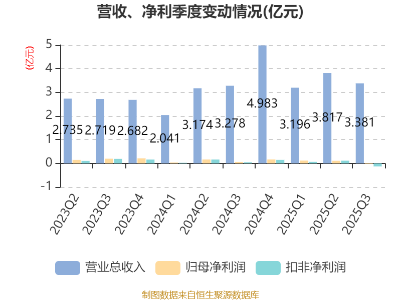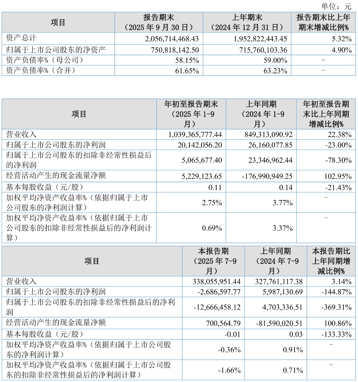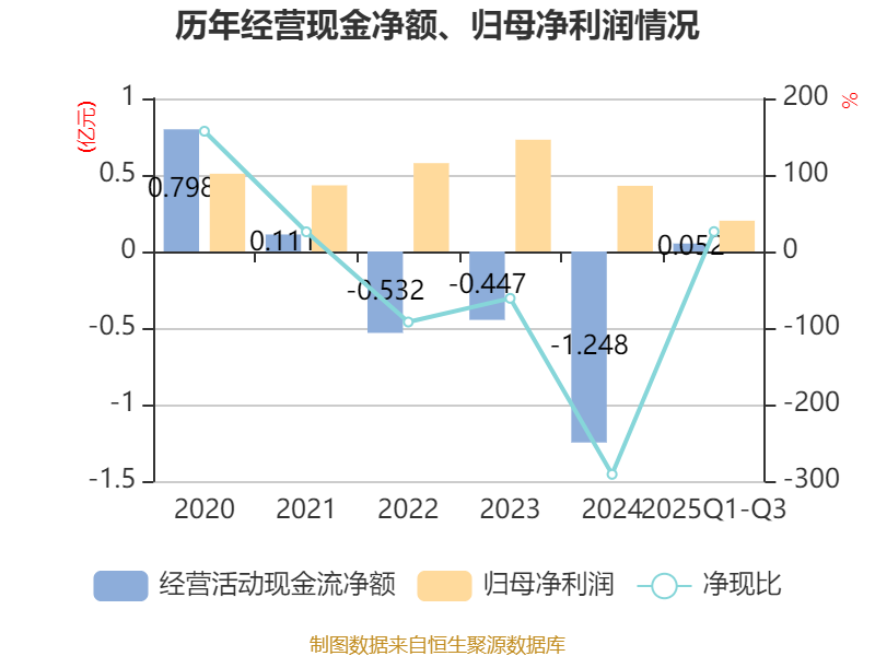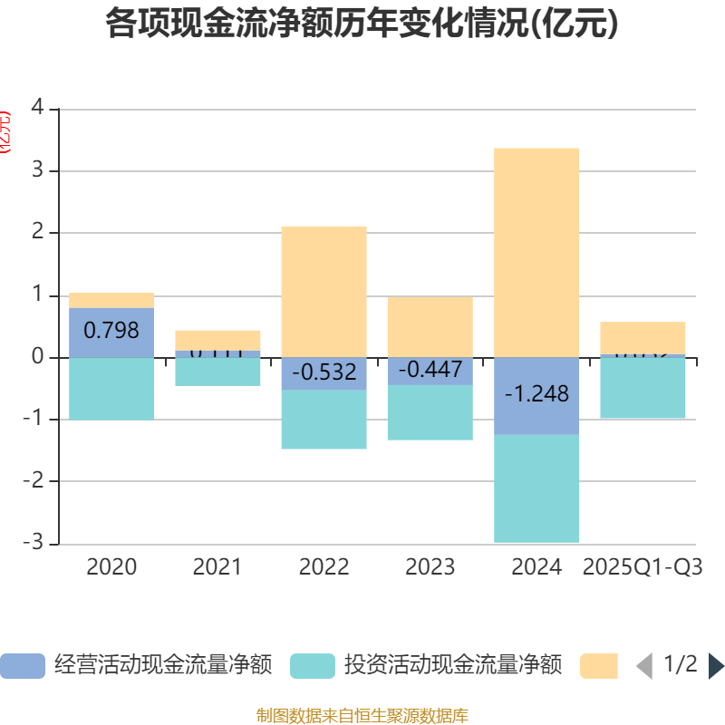 2025年前三季度,公司经营活动现金流净额为522.91万元,同比增加1.82亿元;筹资活动现金流净额5187.88万元,同比减少2.03亿元;投资活动现金流净额-9787.77万元,上年同期为-1.01亿元。