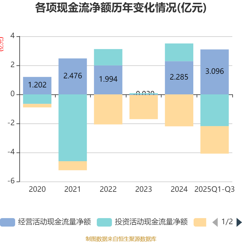 2025年前三季度,公司经营活动现金流净额为3.1亿元,同比增长93.77%;筹资活动现金流净额-1.89亿元,同比减少1219.66万元;投资活动现金流净额-2.19亿元,上年同期为1919.65万元。