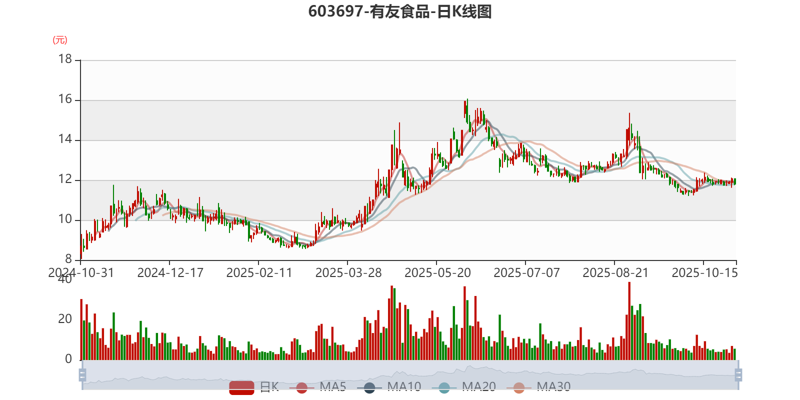 中证智能财讯有友食品(603697)10月31日披露2025年第三季度报告。前三季度公司实现营业总收入12.45亿元,同比增长40.39%;归母净利润1.74亿元,同比增长43.34%;扣非净利润1.54亿元,同比增长46.99%;经营活动产生的现金流量净额为3.1亿元,同比增长93.77%;报告期内,有友食品基本每股收益为0.41元,加权平均净资产收益率为9.60%。