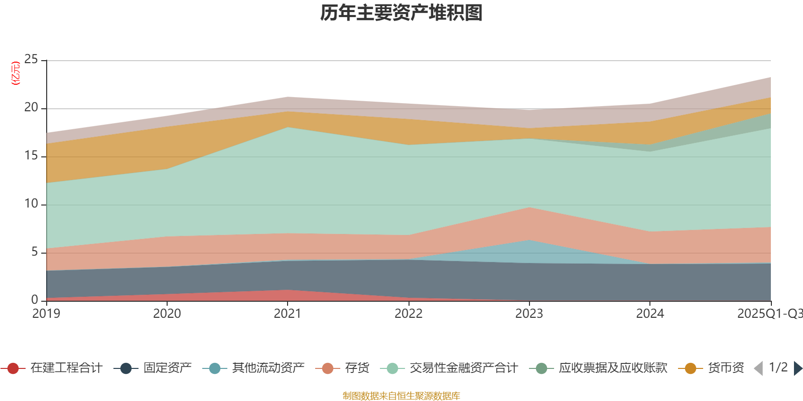 资产重大变化方面,截至2025年三季度末,公司货币资金较上年末减少30.14%,占公司总资产比重下降4.48个百分点;交易性金融资产合计较上年末增加23.81%,占公司总资产比重上升3.69个百分点;应收票据及应收账款较上年末增加107.52%,占公司总资产比重上升3.02个百分点;固定资产较上年末增加1.84%,占公司总资产比重下降1.89个百分点。