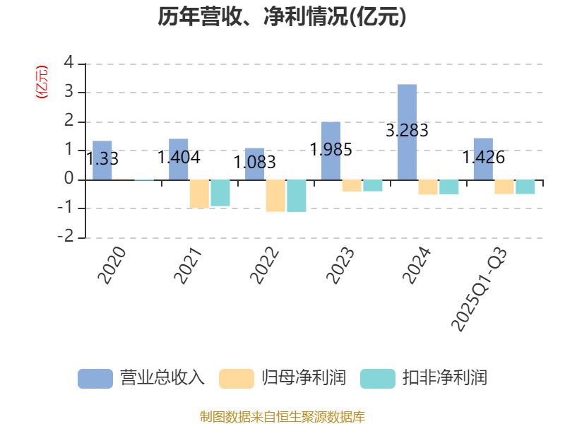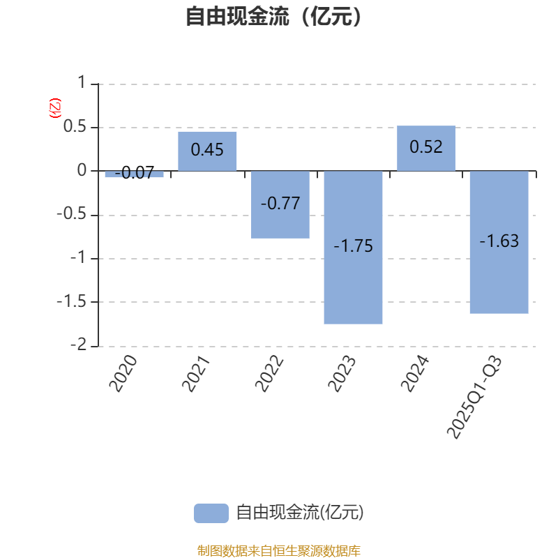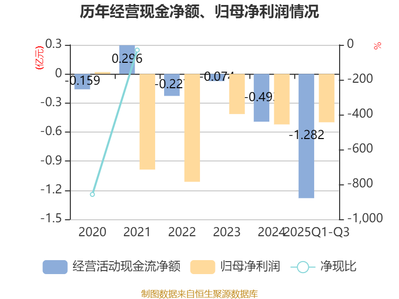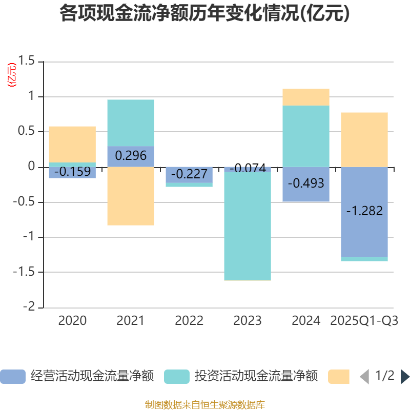 2025年前三季度,公司经营活动现金流净额为-1.28亿元,同比减少8485.51万元;筹资活动现金流净额7742.77万元,同比增加7442.77万元;投资活动现金流净额-591.92万元,上年同期为2308.57万元。