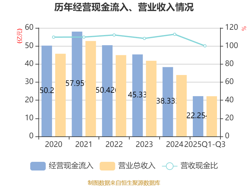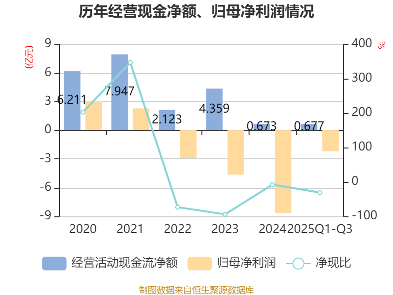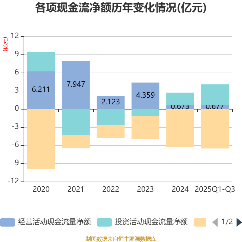 2025年前三季度,公司经营活动现金流净额为6774.99万元,同比增长94.75%;筹资活动现金流净额-6.54亿元,同比减少1.25亿元;投资活动现金流净额3.38亿元,上年同期为1.57亿元。