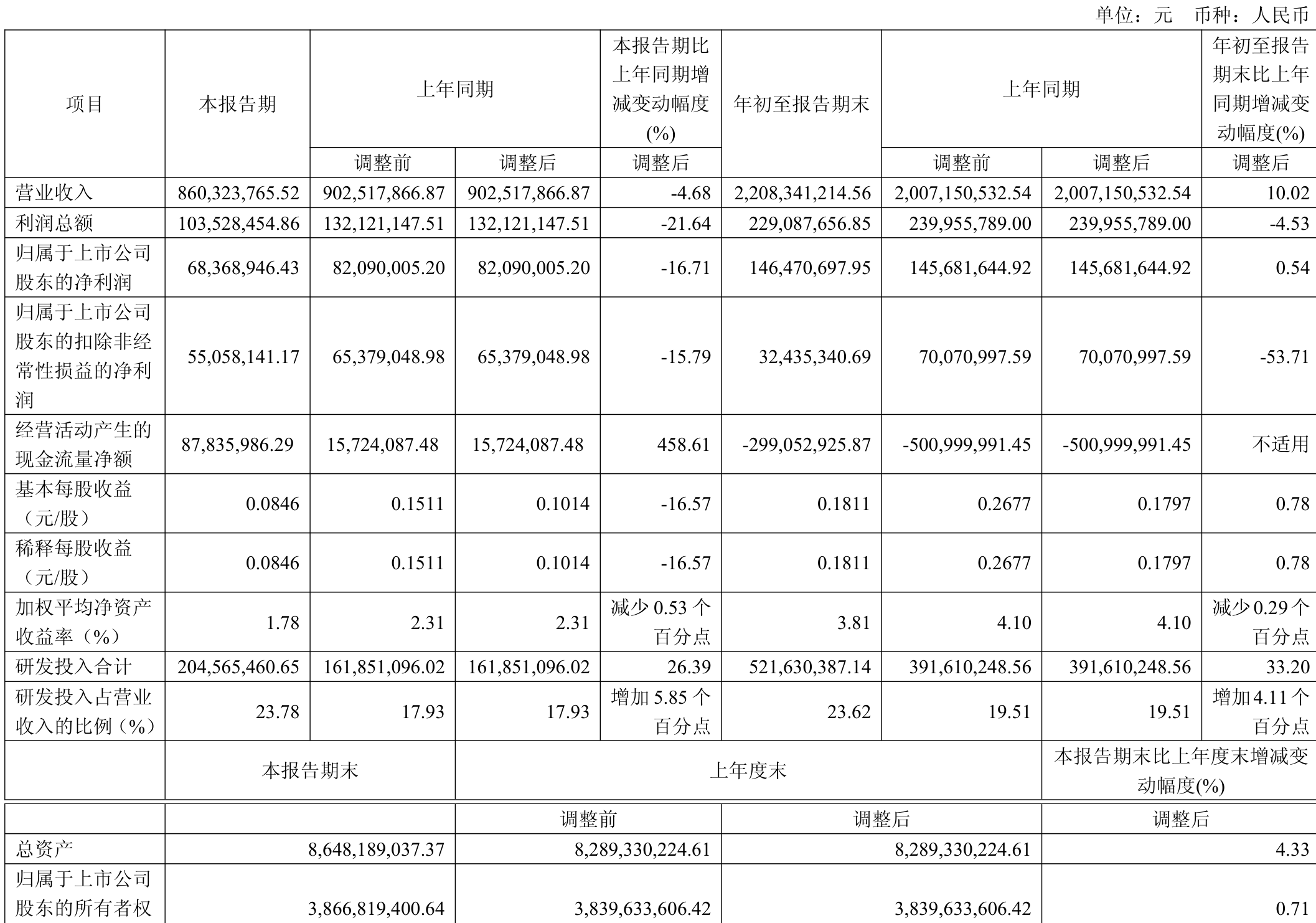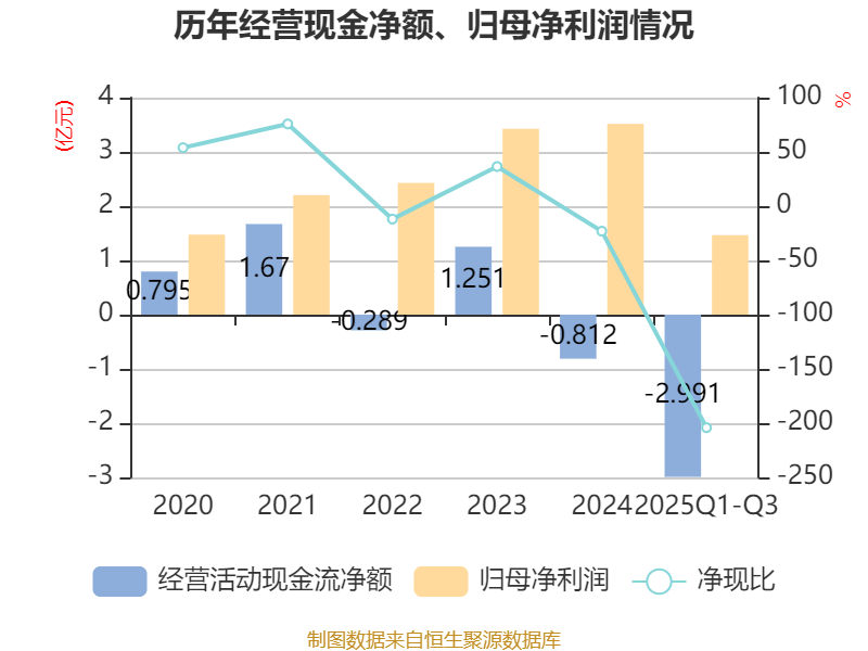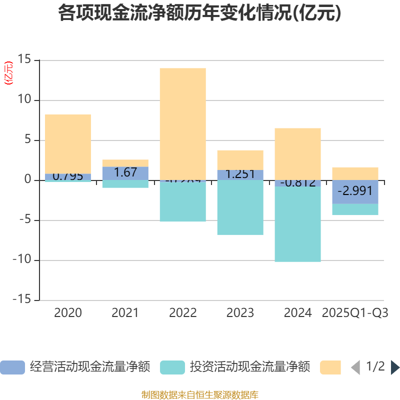 2025年前三季度,公司经营活动现金流净额为-2.99亿元,同比增加2.02亿元;筹资活动现金流净额1.58亿元,同比减少3.64亿元;投资活动现金流净额-1.39亿元,上年同期为-8.58亿元。