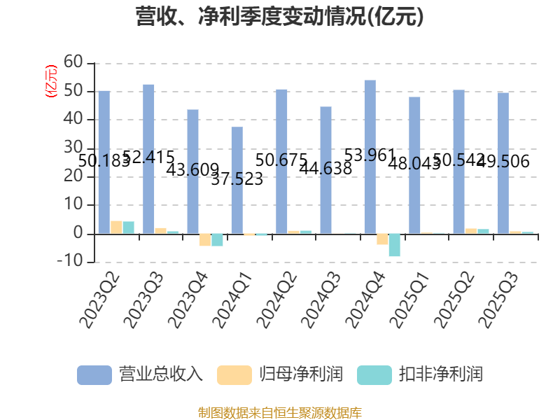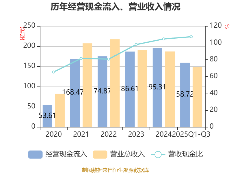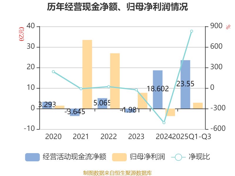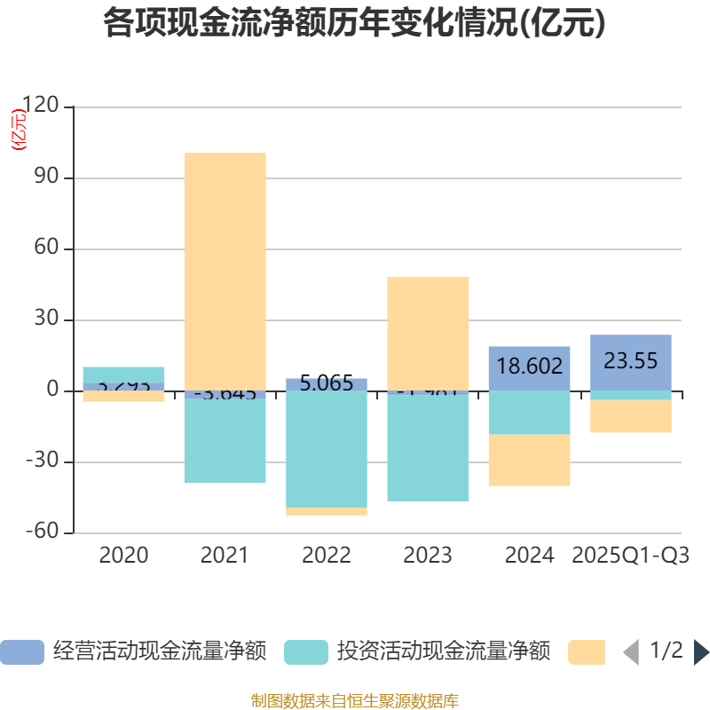2025年前三季度,公司经营活动现金流净额为23.55亿元,同比增长134.69%;筹资活动现金流净额-13.73亿元,同比减少1805.81万元;投资活动现金流净额-4.03亿元,上年同期为-9.42亿元。