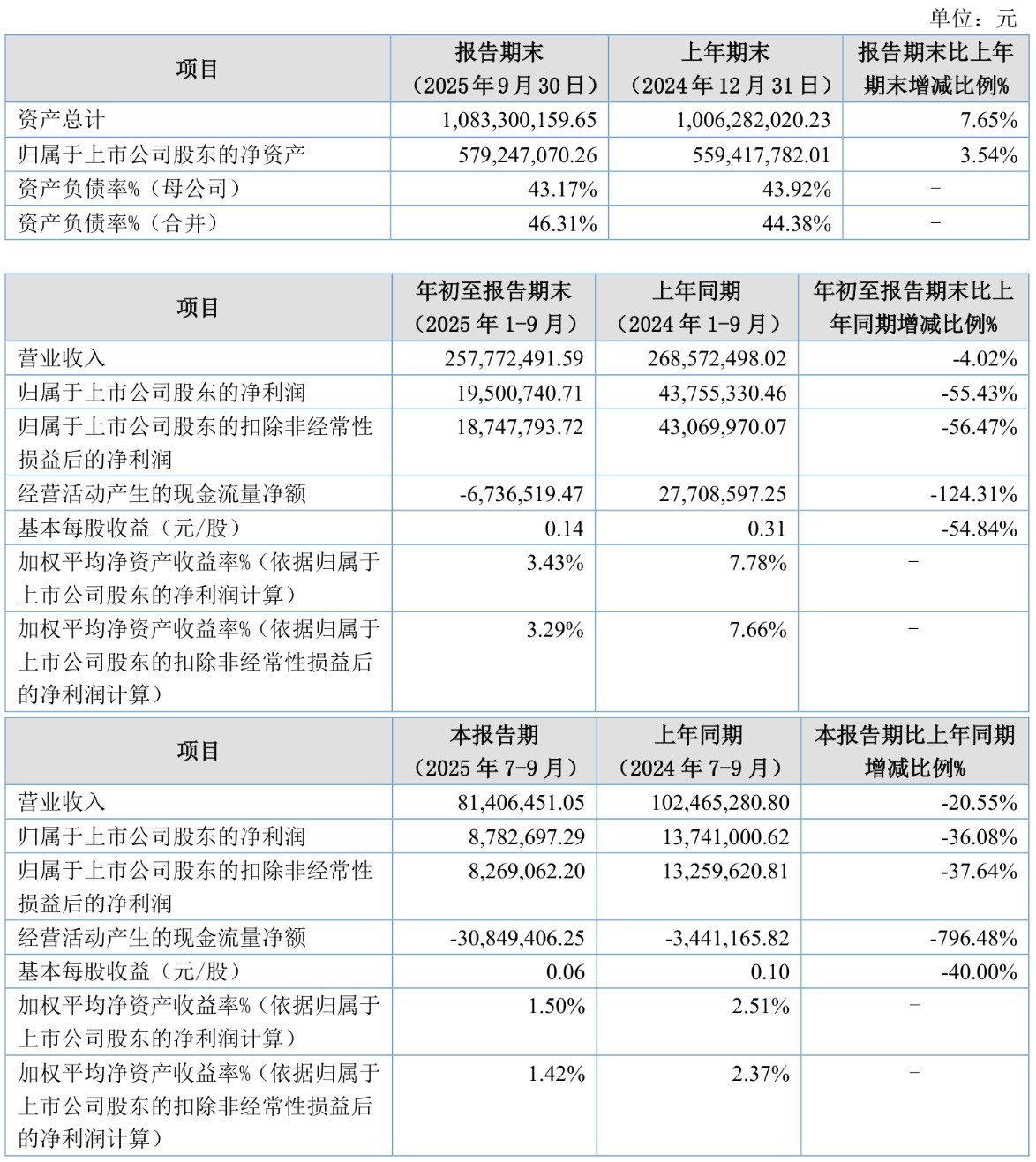 资产重大变化方面,截至2025年三季度末,公司固定资产较上年末增加1489.73%,占公司总资产比重上升11.78个百分点;其他应收款(含利息和股利)较上年末减少86.47%,占公司总资产比重下降6.49个百分点;应收股利较上年末减少100%,占公司总资产比重下降6.42个百分点;货币资金较上年末减少64.54%,占公司总资产比重下降2.56个百分点。