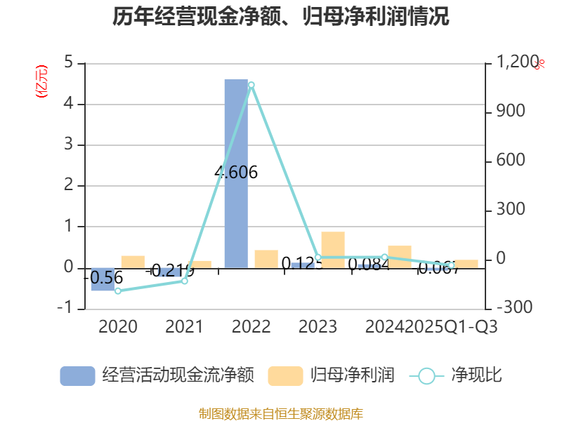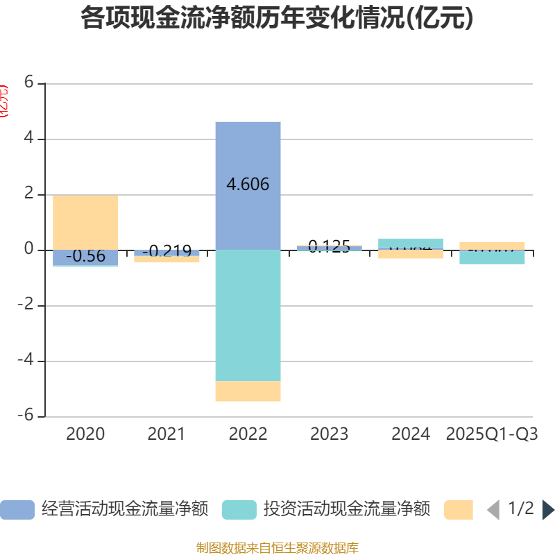2025年前三季度,公司经营活动现金流净额为-673.65万元,同比减少3444.51万元;筹资活动现金流净额2755.01万元,同比增加7588.78万元;投资活动现金流净额-4570.6万元,上年同期为1704.66万元。