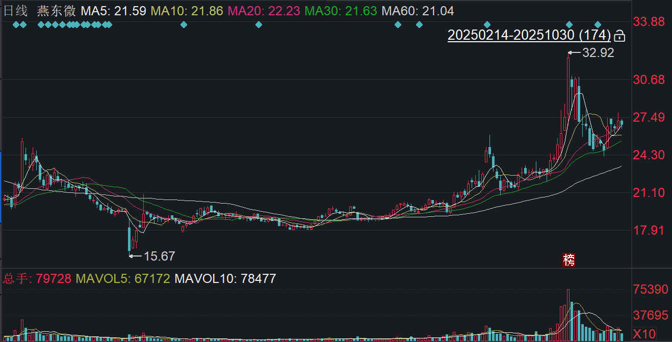 二级市场上,截至30日收盘,燕东微下跌1.33%报26.79元/股,总市值约382.46亿元,今年来公司股价累计上涨超三成。
