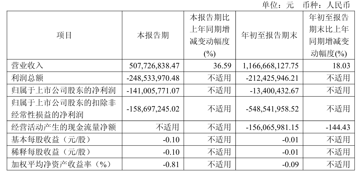 第三季度,公司营业收入为5.08亿元,同比上升36.59%;归母净利润亏损1.41亿元,去年同期亏损1.07亿元,亏损进一步扩大;扣非净利润亏损1.59亿元,去年同期亏损1.19亿元。