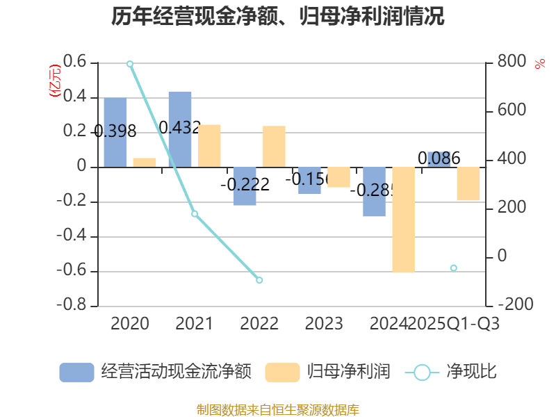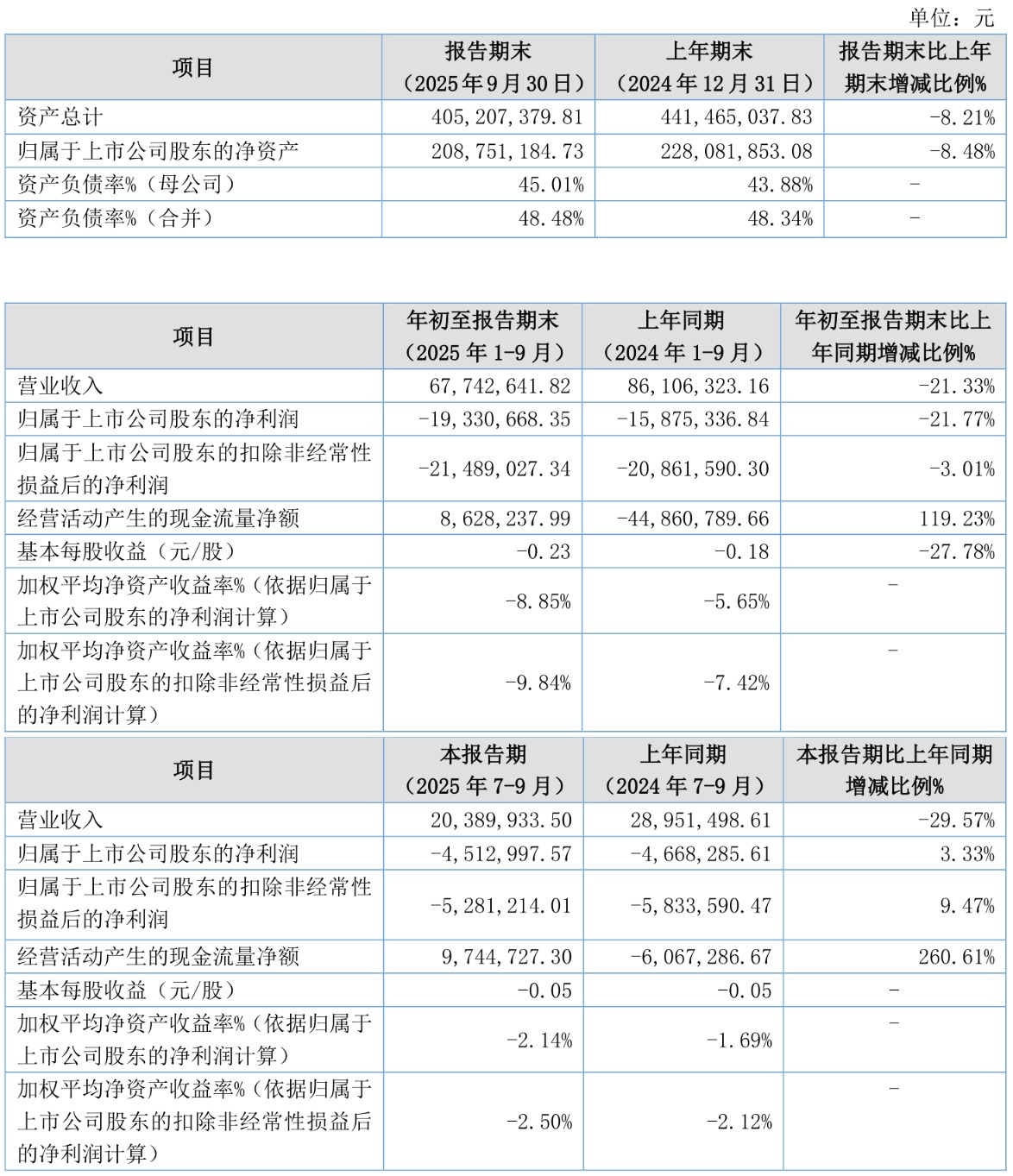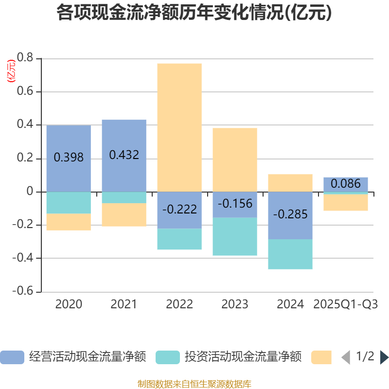 2025年前三季度,公司经营活动现金流净额为862.82万元,同比增加5348.9万元;筹资活动现金流净额-980.39万元,同比减少4145.73万元;投资活动现金流净额-160.68万元,上年同期为-3695.45万元。