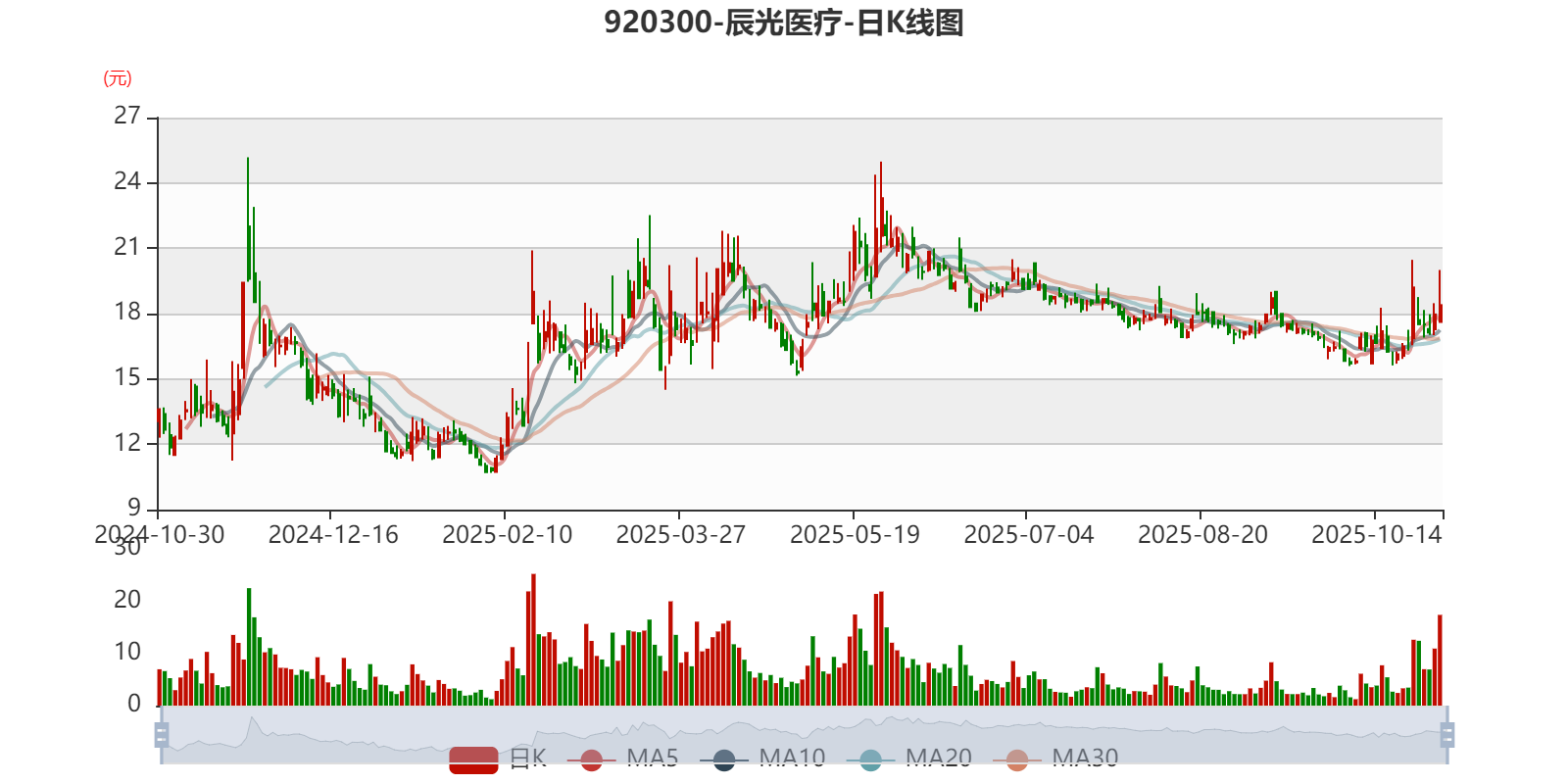 以10月30日收盘价计算,辰光医疗目前市盈率(TTM)约为-24.53倍,市净率(LF)约7.56倍,市销率(TTM)约15.69倍。