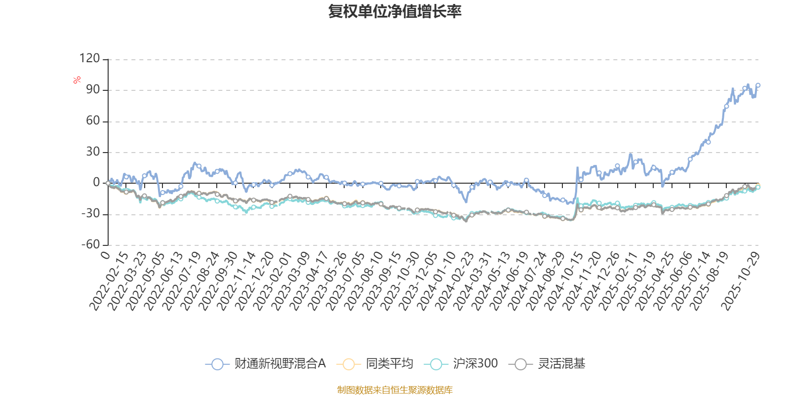 截至10月29日,财通新视野混合A近三个月复权单位净值增长率为24.46%,位于同类可比基金277/1287;近半年复权单位净值增长率为79.40%,位于同类可比基金53/1287;近一年复权单位净值增长率为79.27%,位于同类可比基金52/1287;近三年复权单位净值增长率为113.07%,位于同类可比基金20/1286。