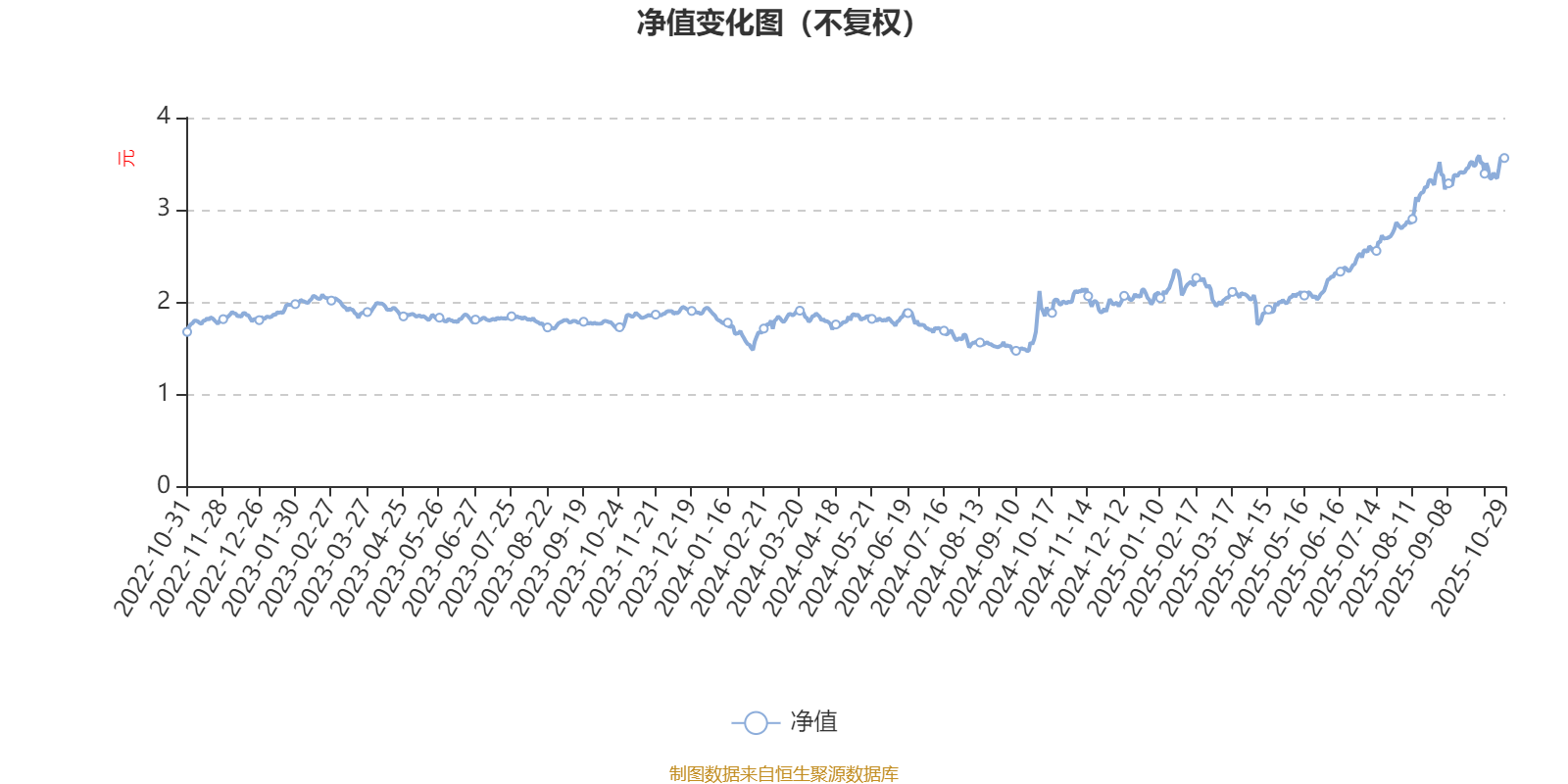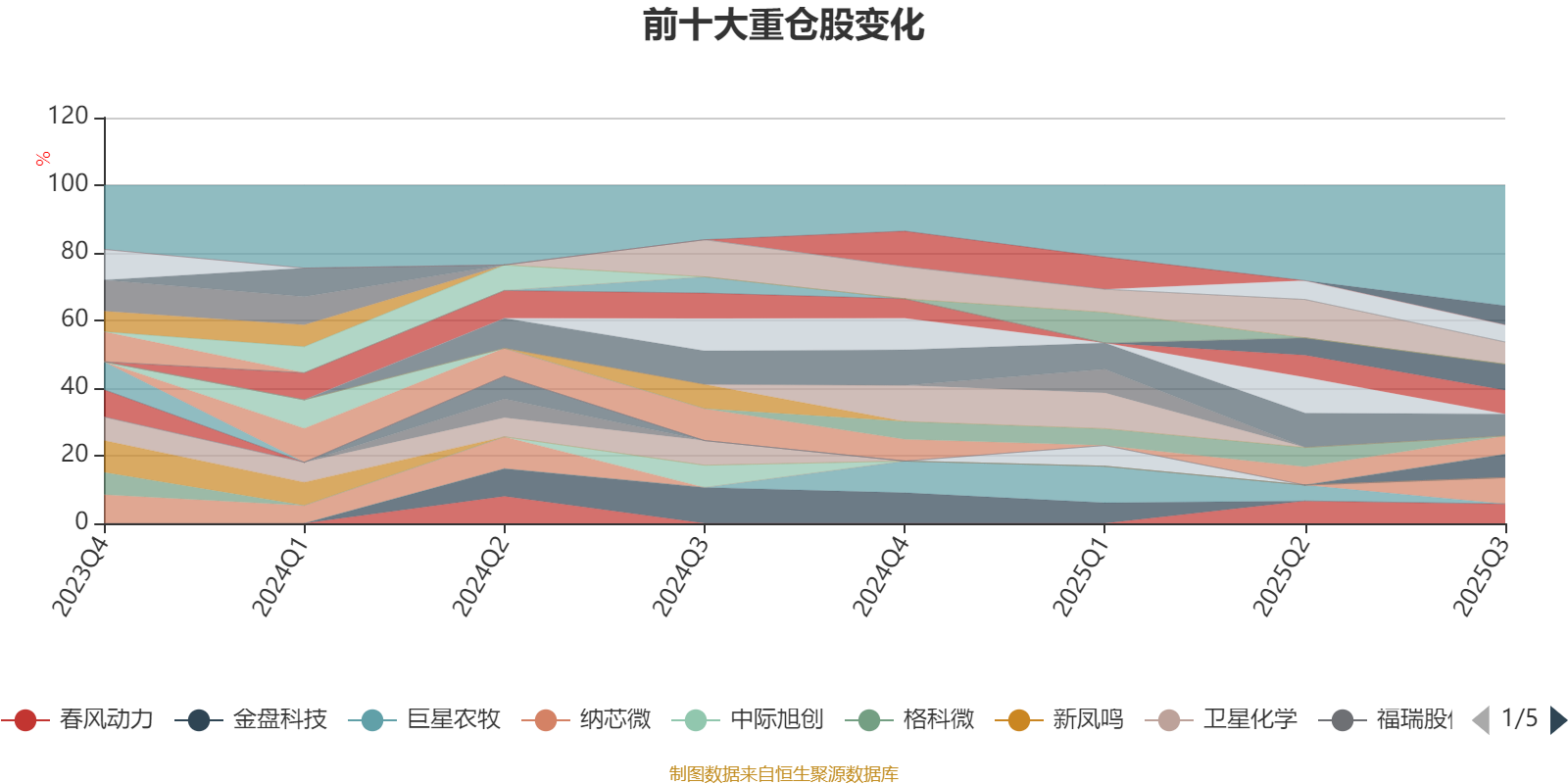 该基金持股集中度较高,近2年前十大重仓股集中度长期超过60%。截至2025年三季度末,基金十大重仓股分别是纳芯微、金诚信、甬矽电子、南芯科技、新易盛、沪电股份、春风动力、松原股份、伟测科技、三环集团。