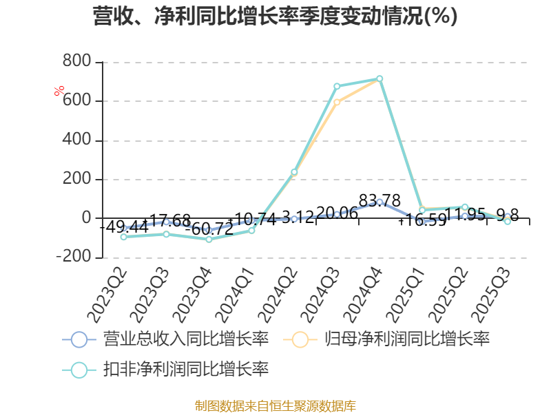 资产重大变化方面,截至2025年三季度末,公司货币资金较上年末减少12.46%,占公司总资产比重下降5.21个百分点;交易性金融资产合计较上年末增加260.37%,占公司总资产比重上升4.58个百分点;其他流动资产较上年末增加10.59%,占公司总资产比重上升2.05个百分点;存货较上年末减少11.04%,占公司总资产比重下降1.88个百分点。