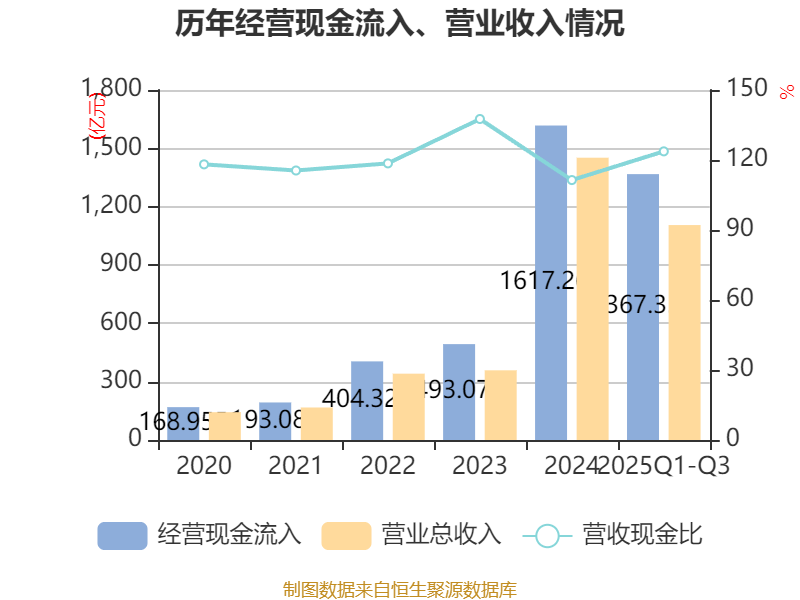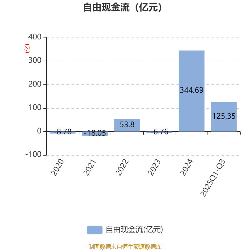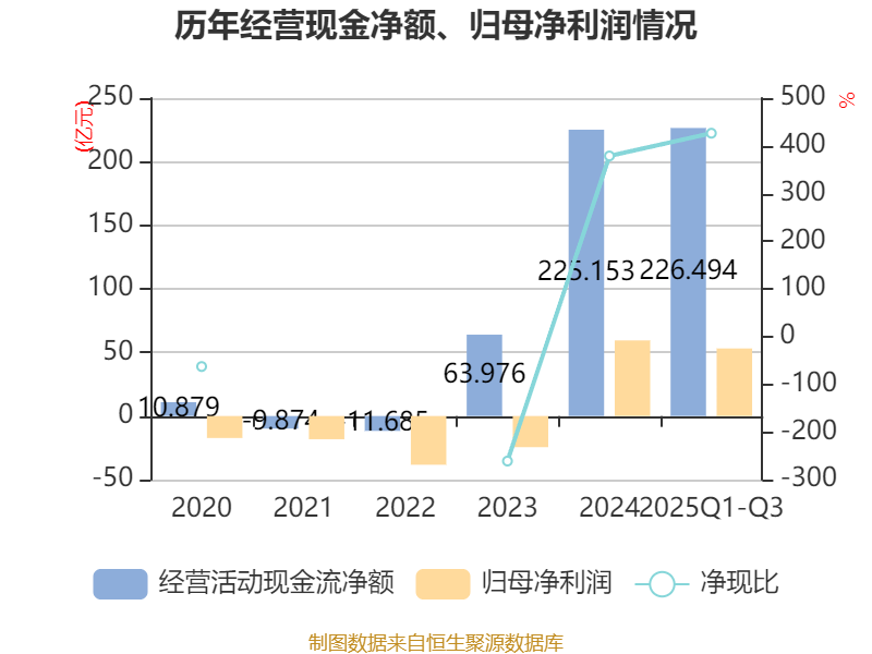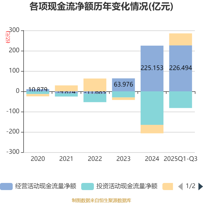 2025年前三季度,公司经营活动现金流净额为226.49亿元,同比增长13.18%;筹资活动现金流净额59.07亿元,同比增加96.67亿元;投资活动现金流净额-82.03亿元,上年同期为-57.02亿元。
