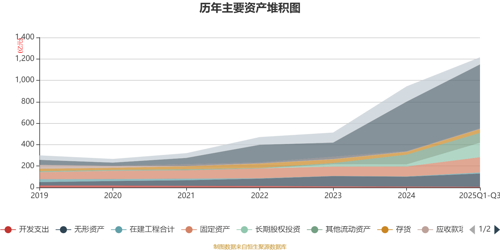 资产重大变化方面,截至2025年三季度末,公司长期股权投资较上年末增加583.76%,占公司总资产比重上升9.04个百分点;交易性金融资产合计较上年末减少93.57%,占公司总资产比重下降4.08个百分点;其他非流动资产较上年末减少88.61%,占公司总资产比重下降2.35个百分点;其他流动资产较上年末增加1.1%,占公司总资产比重下降2.08个百分点。