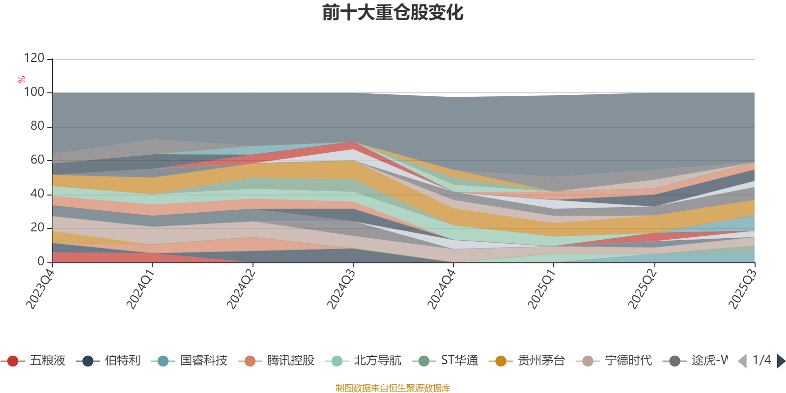 该基金持股集中度较高。截至2025年三季度末,基金十大重仓股分别是寒武纪、皖仪科技、中芯国际、快手-W、国睿科技、宁德时代、中科蓝讯、ST华通、阿里巴巴-W、迪威尔。