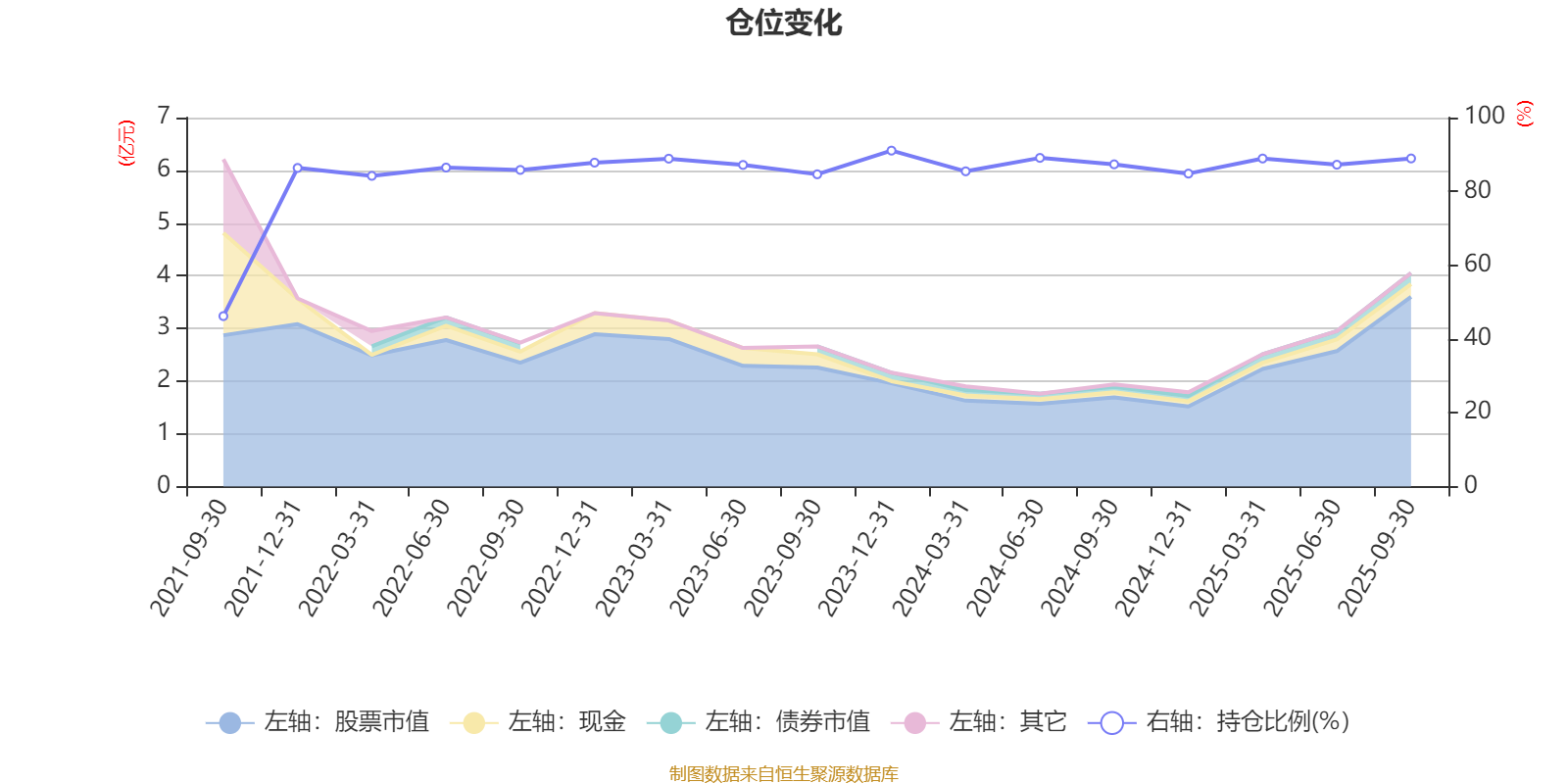 据定期报告数据统计,近三年平均股票仓位为87.61%,同类平均为85.66%。2023年末基金达到91.05%的最高仓位,2021年三季度末最低,为46.2%。