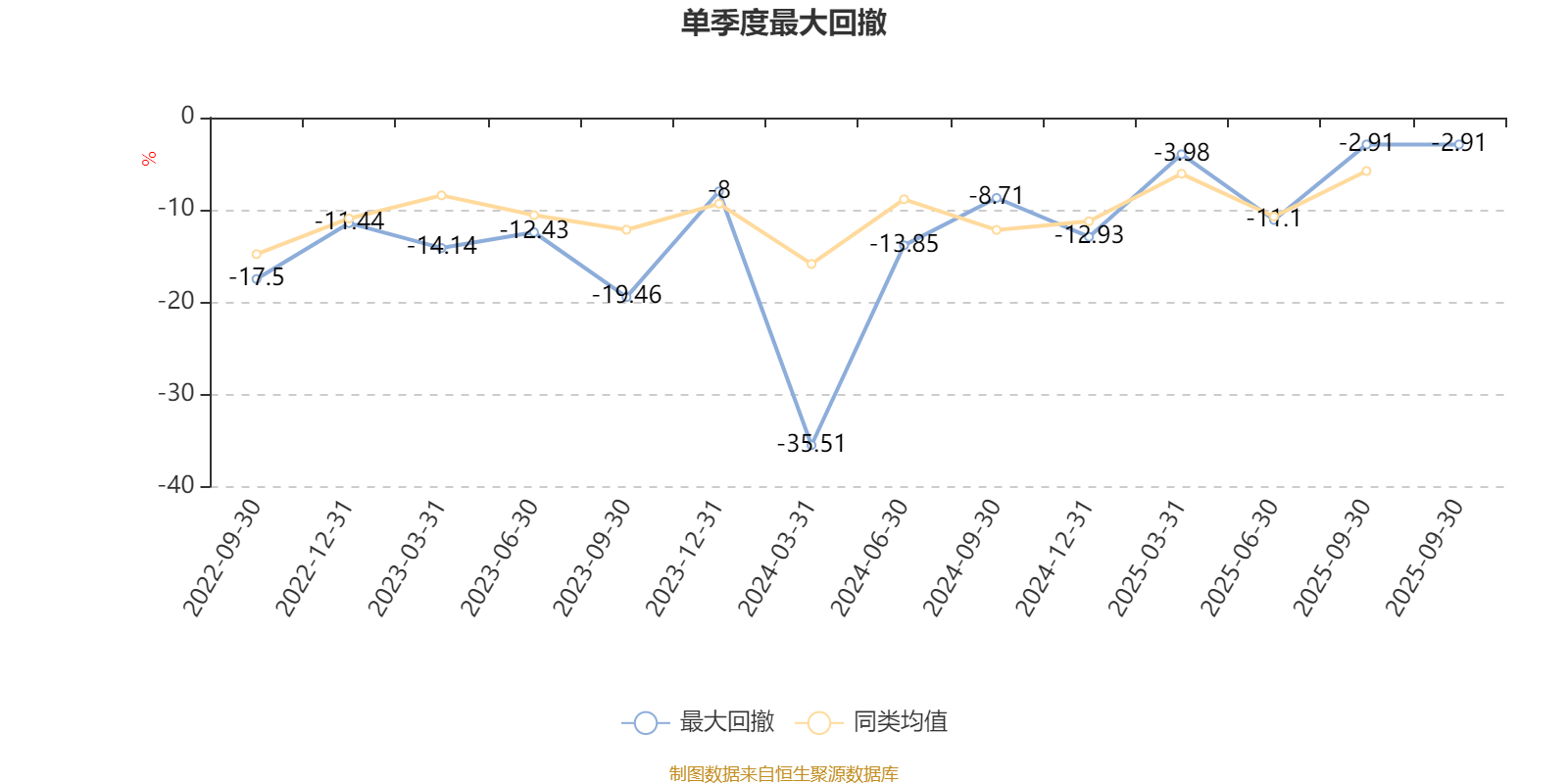 截至10月29日,基金近三年最大回撤为53.56%,同类可比基金排名344/363。单季度最大回撤出现在2024年一季度,为35.51%。