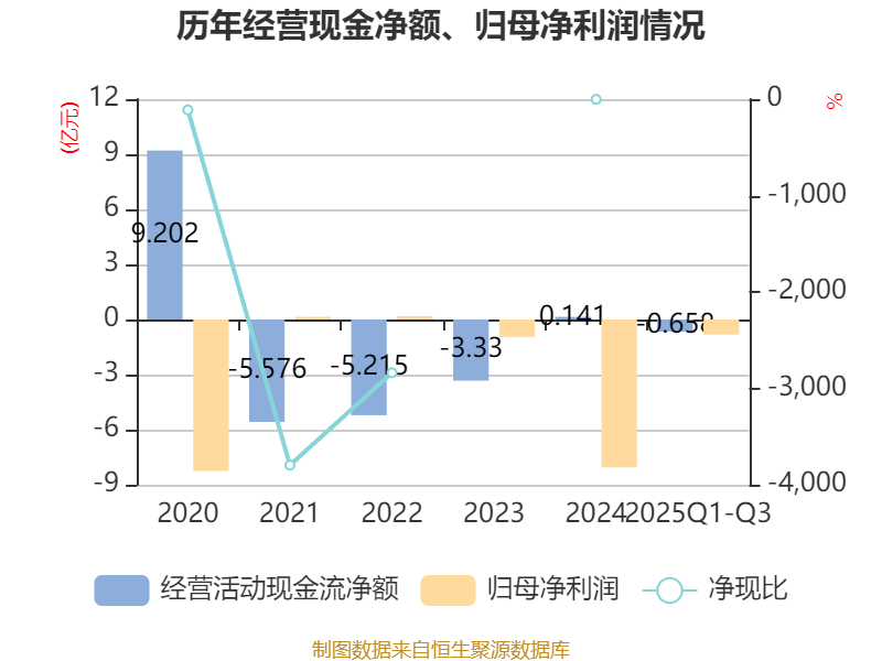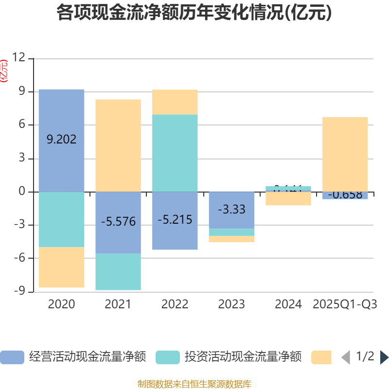 2025年前三季度,公司经营活动现金流净额为-6577.65万元,同比增加45.51万元;筹资活动现金流净额6.71亿元,同比增加7.67亿元;投资活动现金流净额-290.36万元,上年同期为2092.15万元。
