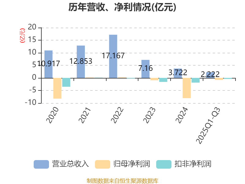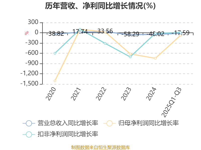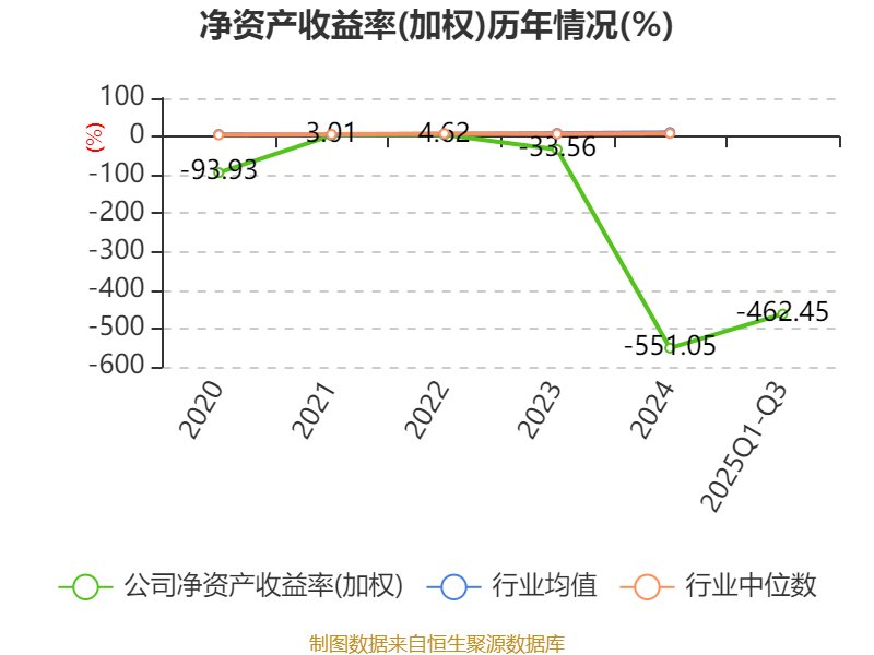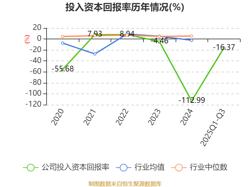 盈利能力方面, 2025年前三季度公司加权平均净资产收益率为-462.45%,同比下降438.86个百分点。公司2025年前三季度投入资本回报率为-16.37%,较上年同期下降12.04个百分点。