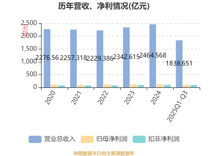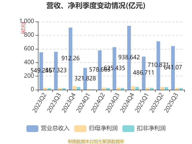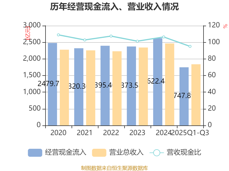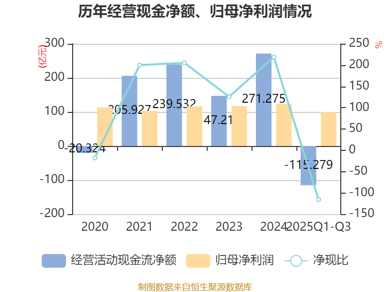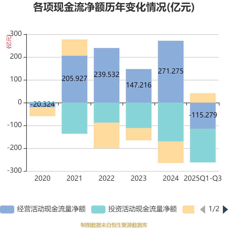 2025年前三季度,公司经营活动现金流净额为-115.28亿元,同比减少190.73亿元;筹资活动现金流净额41.29亿元,同比增加130.22亿元;投资活动现金流净额-147.13亿元,上年同期为-90.94亿元。