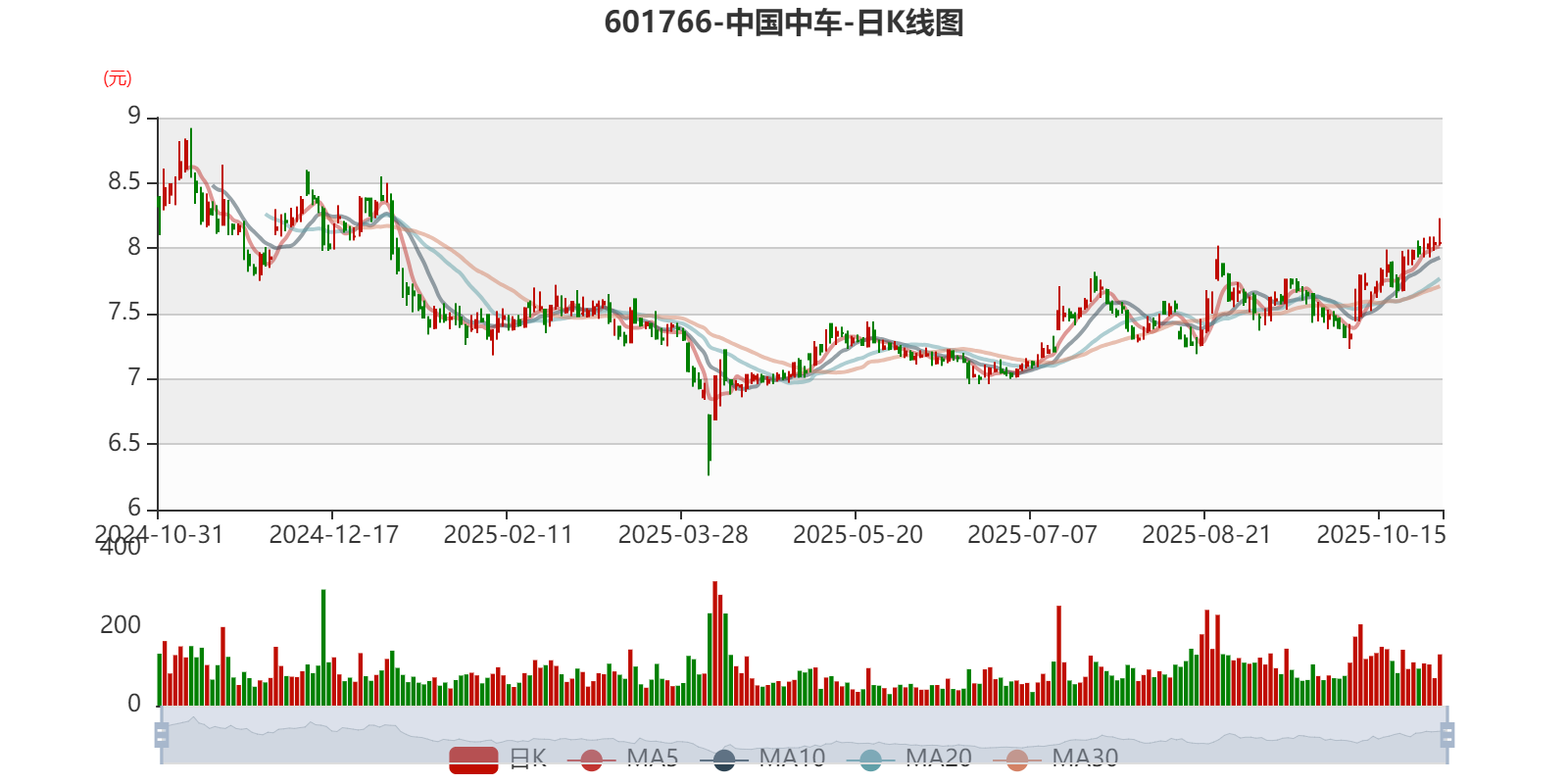 中证智能财讯中国中车(601766)10月31日披露2025年第三季度报告。前三季度公司实现营业总收入1838.65亿元,同比增长20.49%;归母净利润99.64亿元,同比增长37.53%;扣非净利润90.96亿元,同比增长51.67%;经营活动产生的现金流量净额为-115.28亿元,上年同期为75.45亿元;报告期内,中国中车基本每股收益为0.35元,加权平均净资产收益率为5.80%。