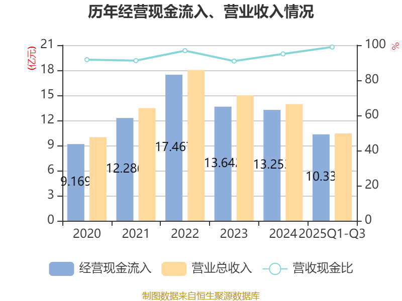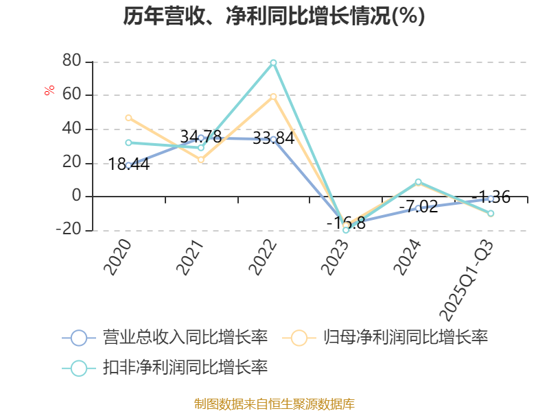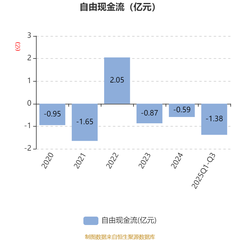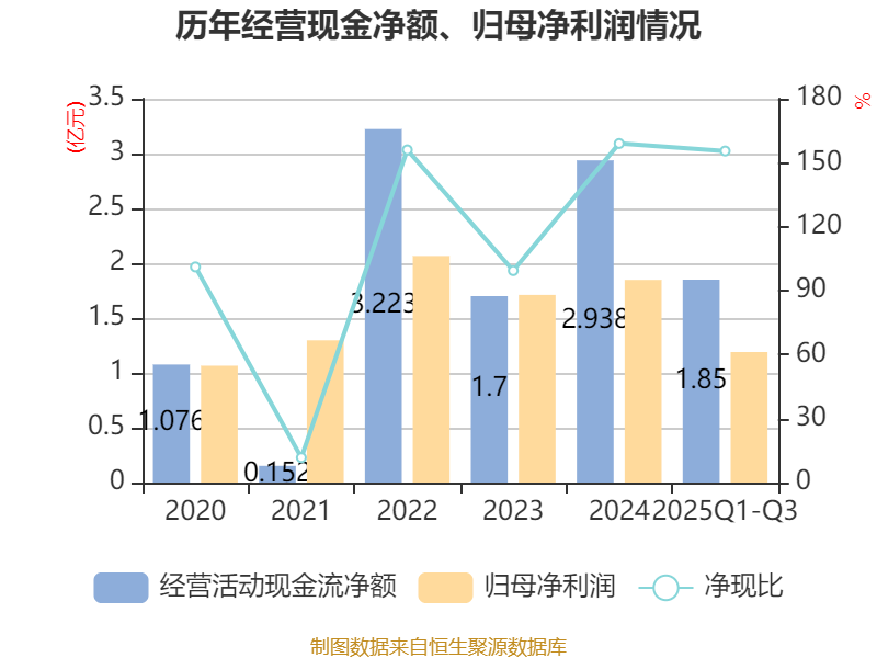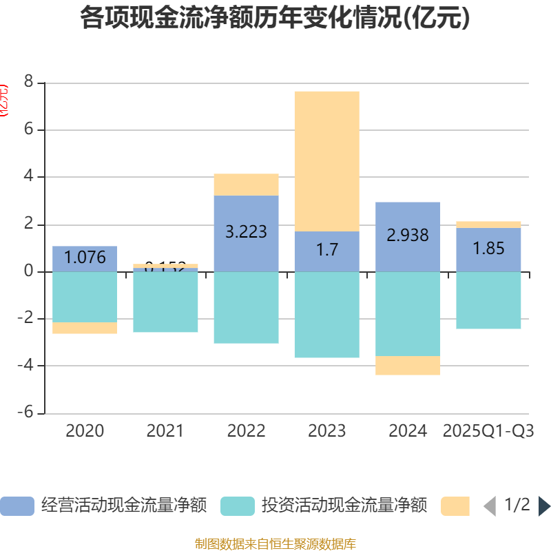 2025年前三季度,公司经营活动现金流净额为1.85亿元,同比下降13.97%;筹资活动现金流净额2754.6万元,同比增加8940.79万元;投资活动现金流净额-2.43亿元,上年同期为-2.35亿元。