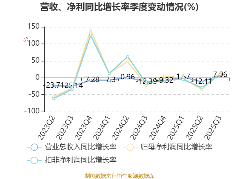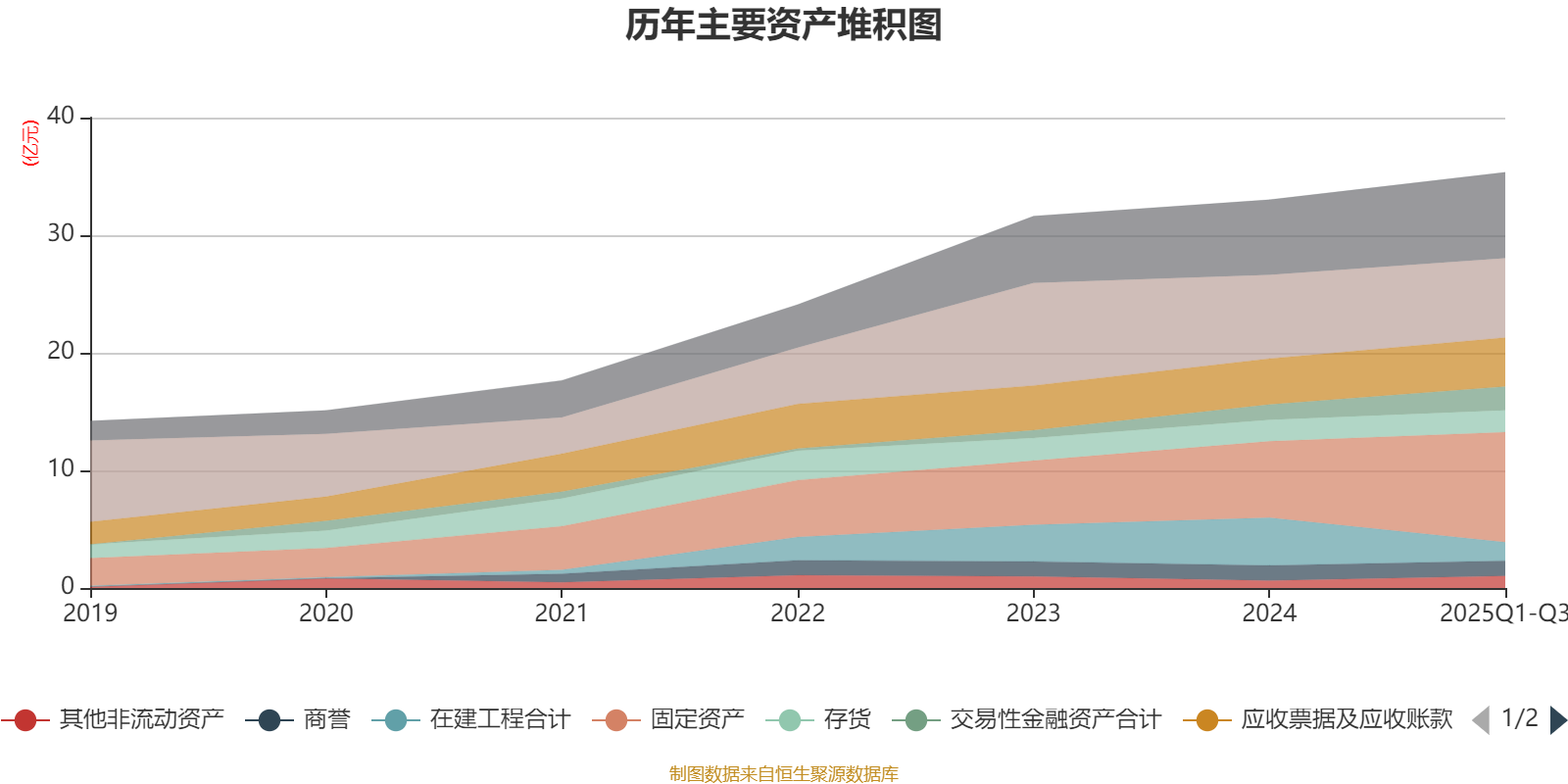 资产重大变化方面,截至2025年三季度末,公司在建工程合计较上年末减少61.13%,占公司总资产比重下降7.82个百分点;固定资产较上年末增加43.95%,占公司总资产比重上升6.78个百分点;货币资金较上年末减少5.23%,占公司总资产比重下降2.48个百分点;交易性金融资产合计较上年末增加55.73%,占公司总资产比重上升1.8个百分点。