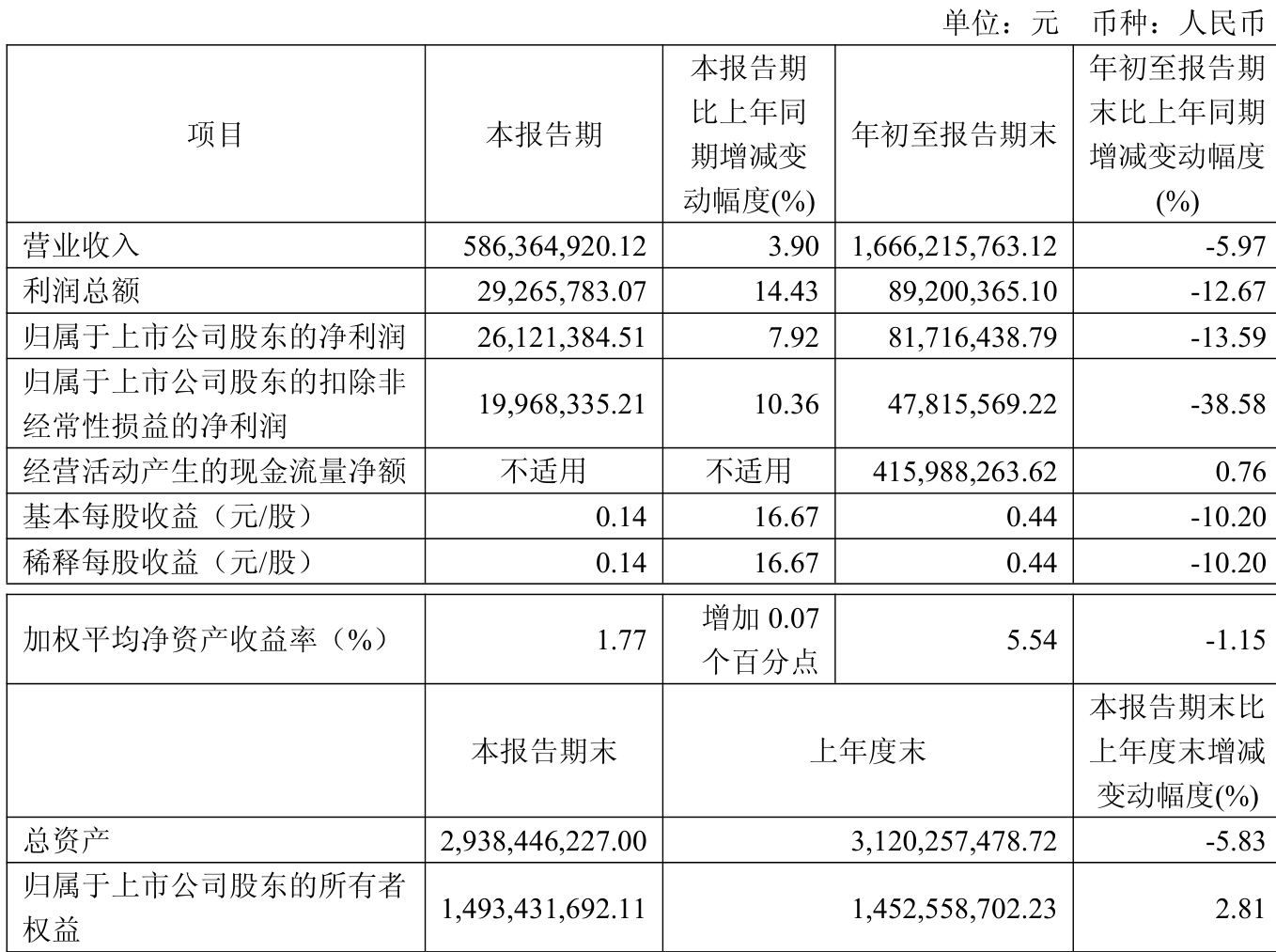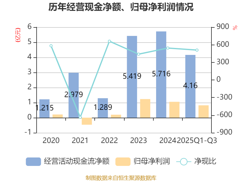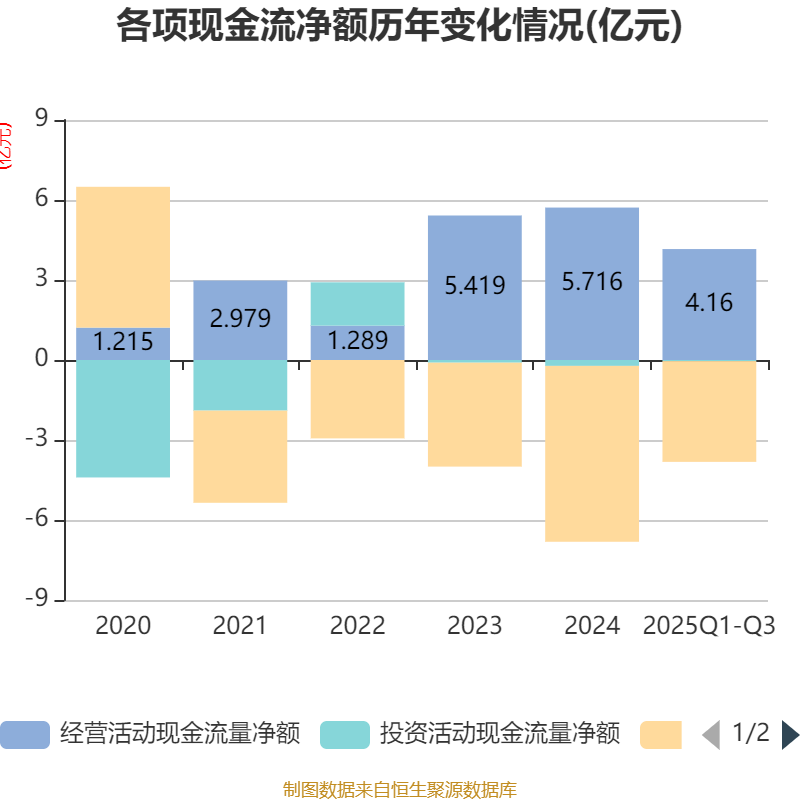 2025年前三季度,公司经营活动现金流净额为4.16亿元,同比增长0.76%;筹资活动现金流净额-3.78亿元,同比增加3696.94万元;投资活动现金流净额-406.54万元,上年同期为-1716.81万元。