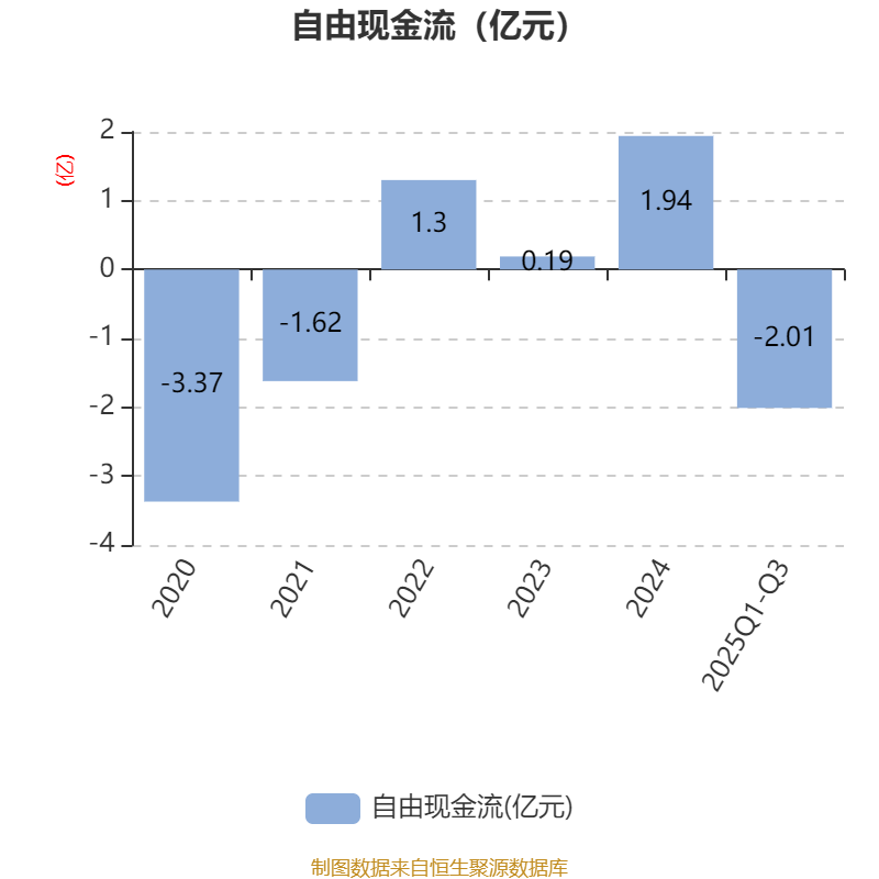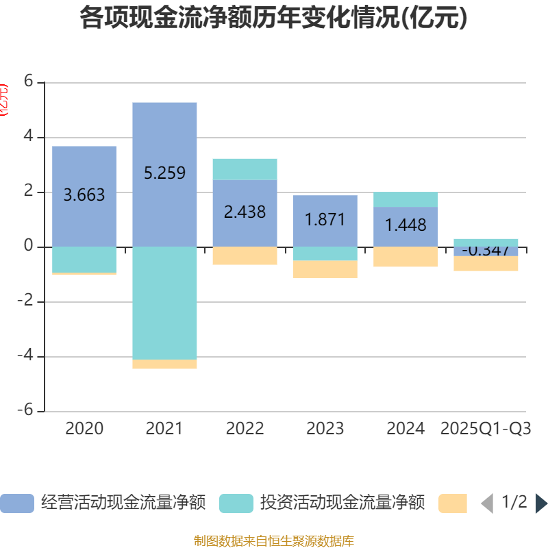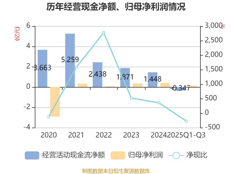 2025年前三季度,公司经营活动现金流净额为-3466.69万元,同比减少4792.23万元;筹资活动现金流净额-5442.58万元,同比增加333.72万元;投资活动现金流净额2785.71万元,上年同期为-516.55万元。