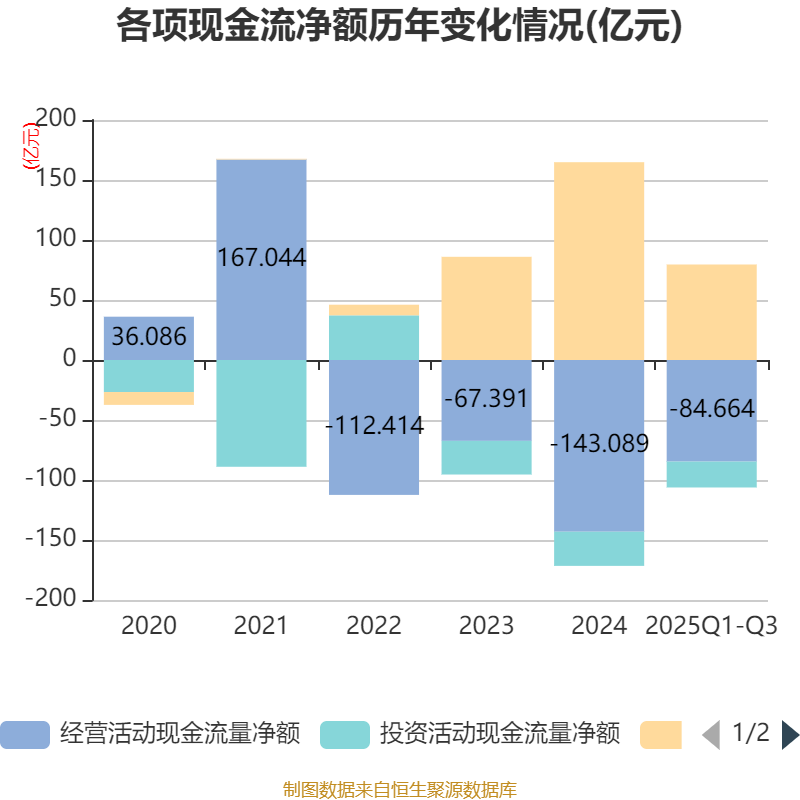 2025年前三季度,公司经营活动现金流净额为-84.66亿元,同比增加88.1亿元;筹资活动现金流净额79.58亿元,同比减少66.62亿元;投资活动现金流净额-21.57亿元,上年同期为-20.5亿元。