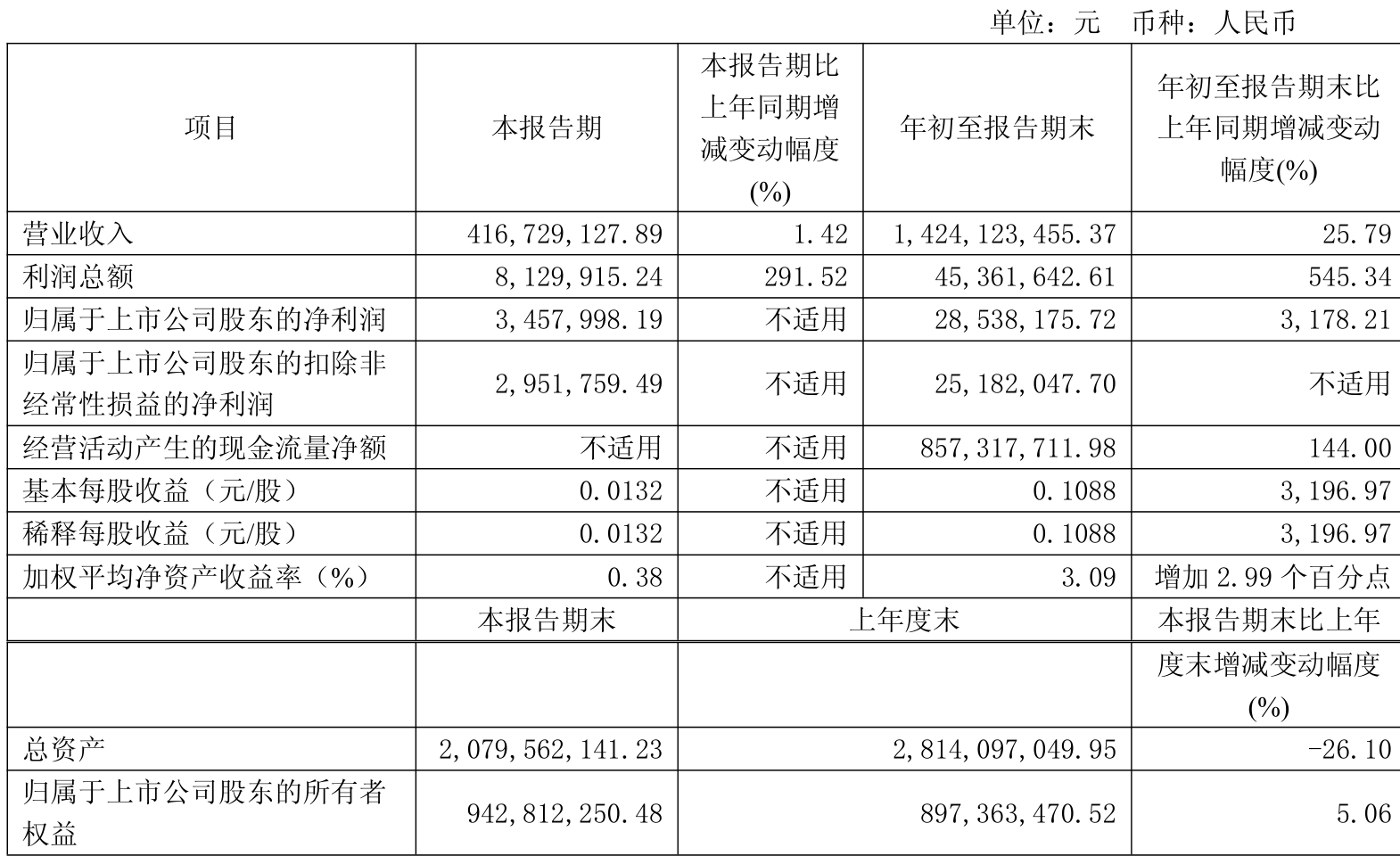 中证智能财讯国投中鲁(600962)10月31日披露2025年第三季度报告。前三季度公司实现营业总收入14.24亿元,同比增长25.79%;归母净利润2853.82万元,同比增长3178.21%;扣非净利润2518.2万元,同比扭亏;经营活动产生的现金流量净额为8.57亿元,同比增长144.00%;报告期内,国投中鲁基本每股收益为0.1088元,加权平均净资产收益率为3.09%。