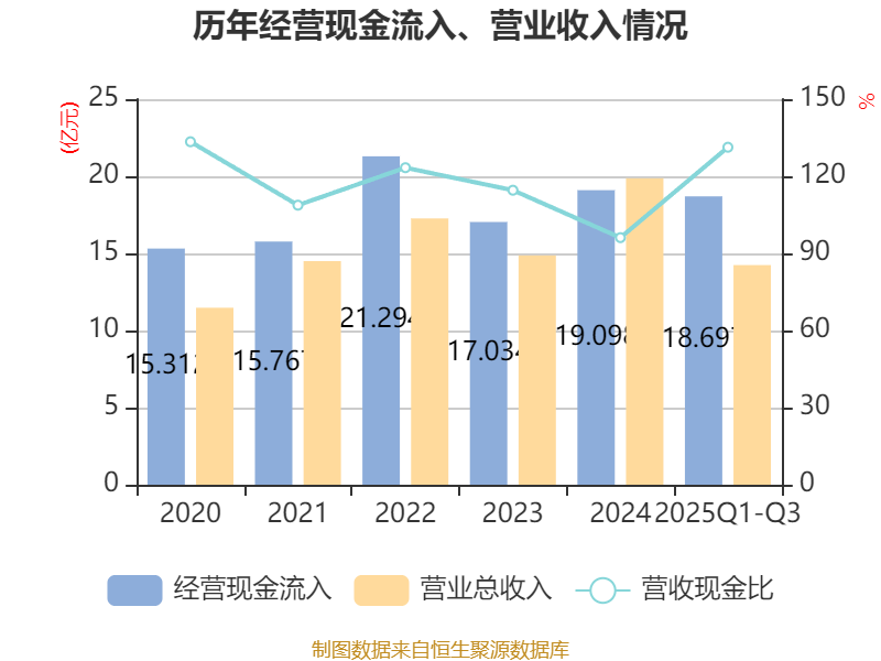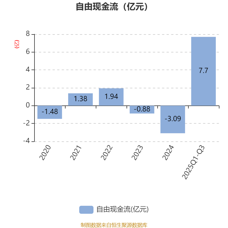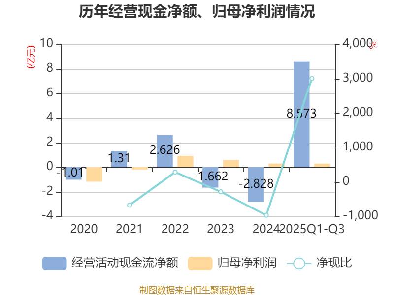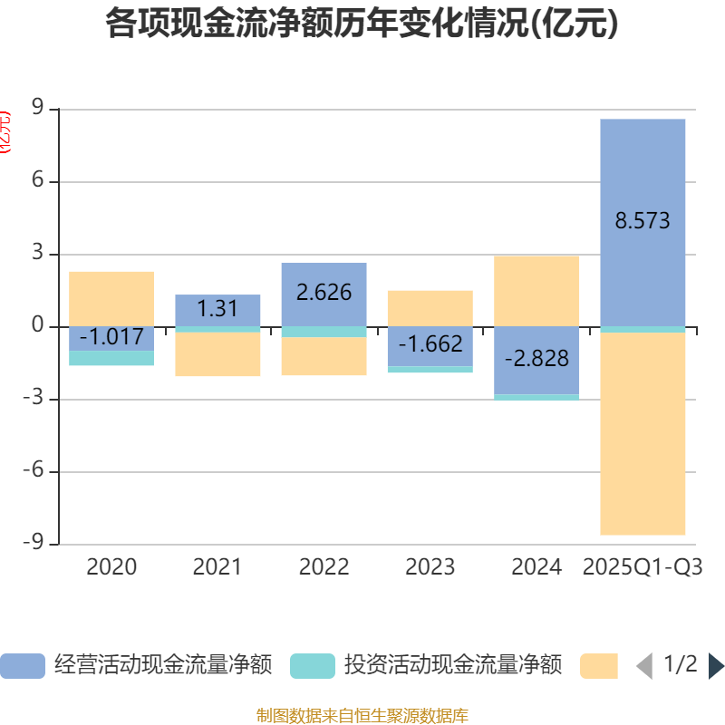 2025年前三季度,公司经营活动现金流净额为8.57亿元,同比增长144%;筹资活动现金流净额-8.37亿元,同比减少4.63亿元;投资活动现金流净额-2694.94万元,上年同期为-1566.04万元。