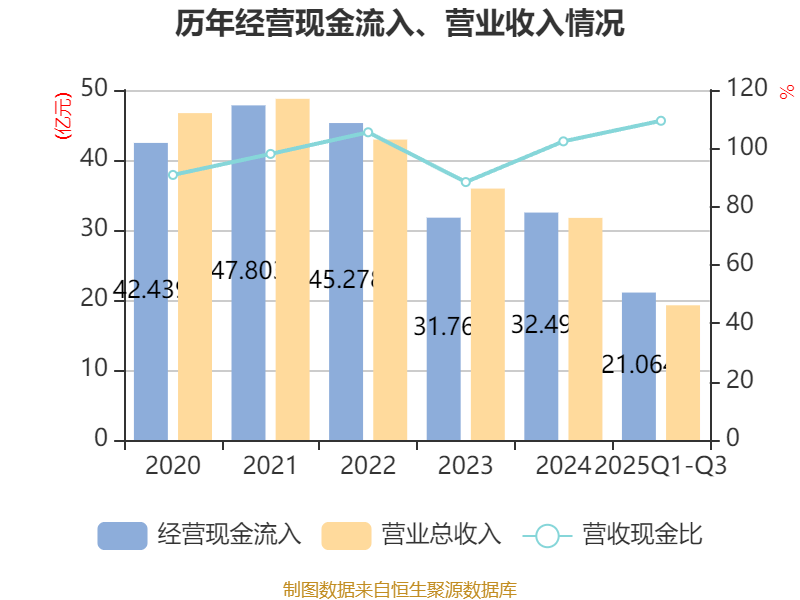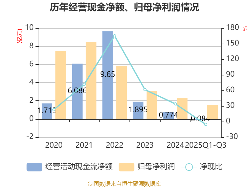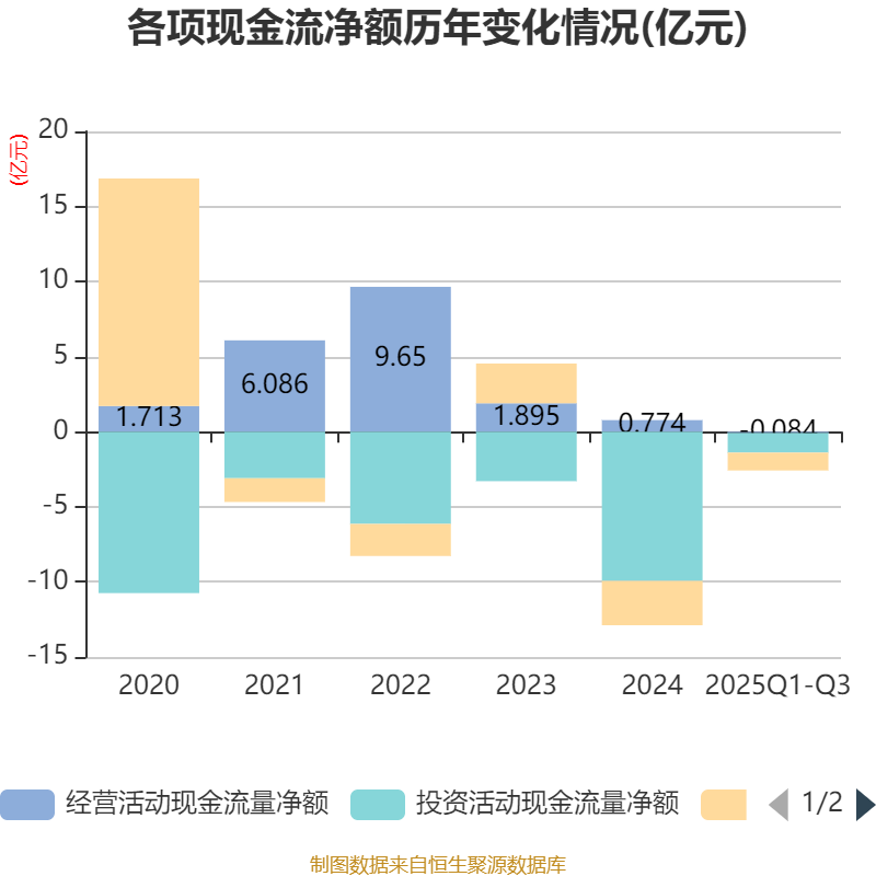 2025年前三季度,公司经营活动现金流净额为-835.48万元,同比增加1.79亿元;筹资活动现金流净额-1.19亿元,同比增加1.15亿元;投资活动现金流净额-1.31亿元,上年同期为-1.81亿元。