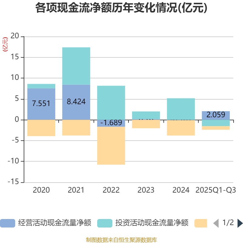2025年前三季度,公司经营活动现金流净额为2.06亿元,同比增加2.36亿元;筹资活动现金流净额-8497.03万元,同比增加2.36亿元;投资活动现金流净额-1.54亿元,上年同期为2.65亿元。