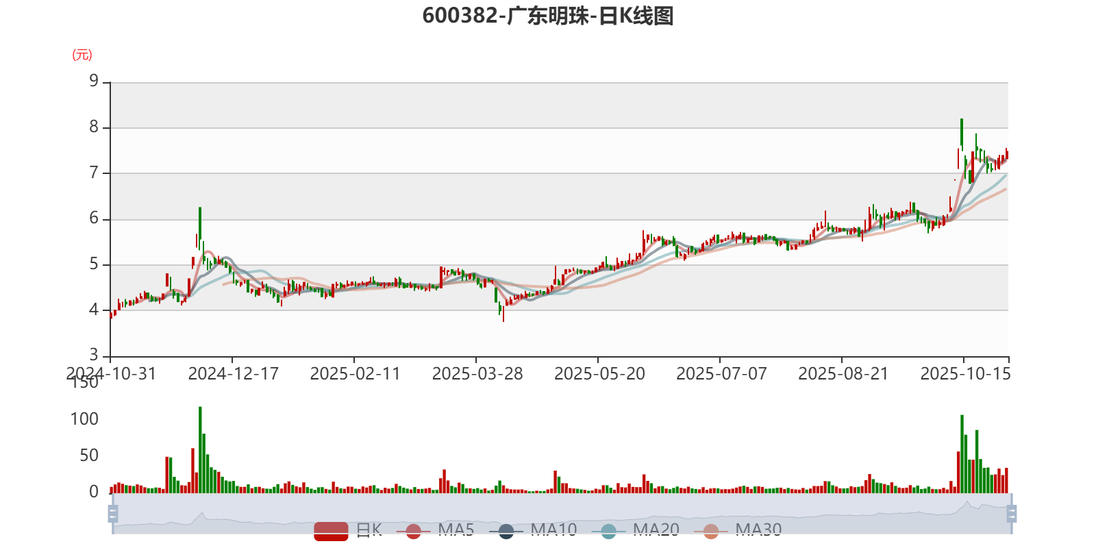 中证智能财讯广东明珠(600382)10月31日披露2025年第三季度报告。前三季度公司实现营业总收入6.73亿元,同比增长150.74%;归母净利润2.34亿元,同比增长941.09%;扣非净利润2.39亿元,同比增长487.53%;经营活动产生的现金流量净额为2.06亿元,上年同期为-3014.1万元;报告期内,广东明珠基本每股收益为0.36元,加权平均净资产收益率为8.39%。