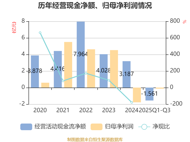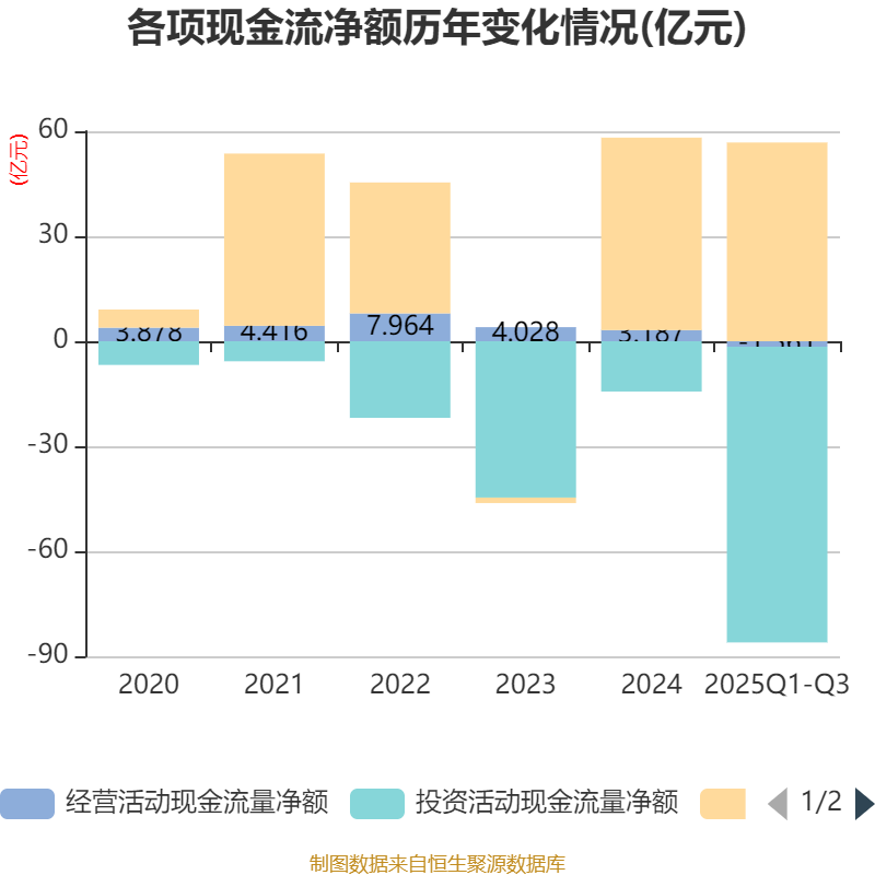 2025年前三季度,公司经营活动现金流净额为-1.56亿元,同比减少5.07亿元;筹资活动现金流净额56.78亿元,同比增加57.26亿元;投资活动现金流净额-84.49亿元,上年同期为-7.69亿元。