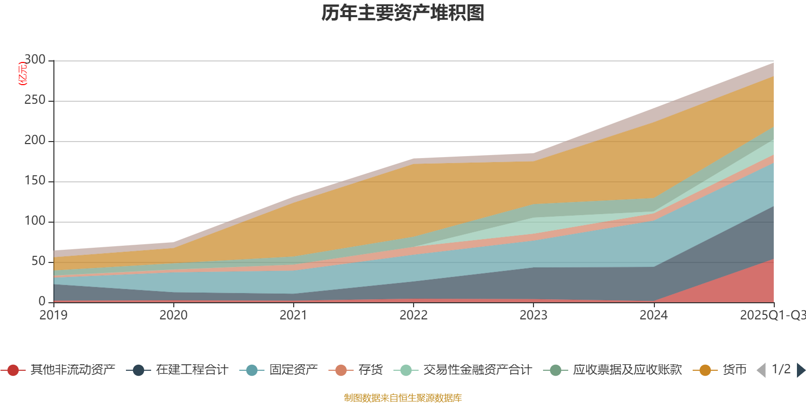 资产重大变化方面,截至2025年三季度末,公司货币资金较上年末减少33.4%,占公司总资产比重下降18.02个百分点;其他非流动资产较上年末增加3445.55%,占公司总资产比重上升17.48个百分点;固定资产较上年末减少6.44%,占公司总资产比重下降5.79个百分点;交易性金融资产合计较上年末增加654.48%,占公司总资产比重上升5.32个百分点。