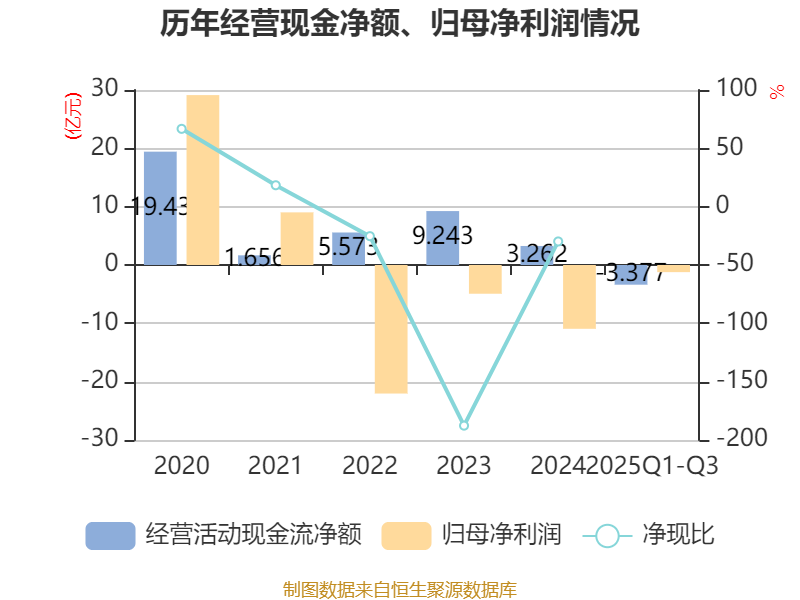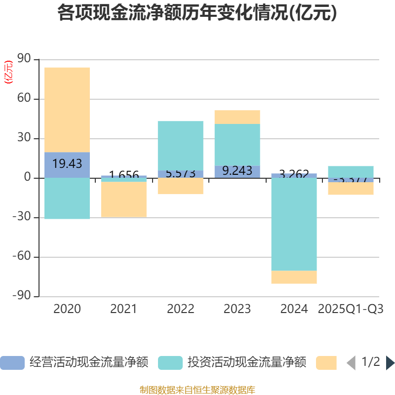 2025年前三季度,公司经营活动现金流净额为-3.38亿元,同比减少1.02亿元;筹资活动现金流净额-9.5亿元,同比减少5.58亿元;投资活动现金流净额8.86亿元,上年同期为-69.31亿元。
