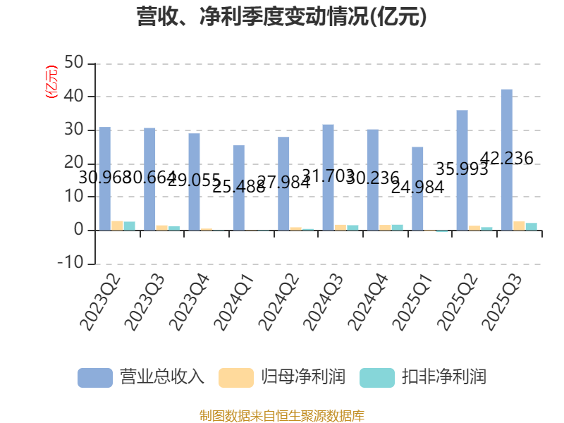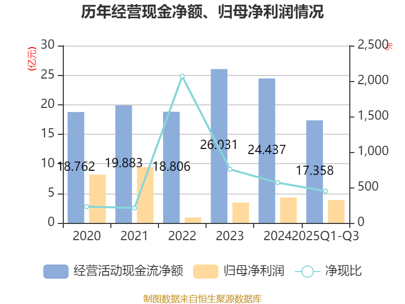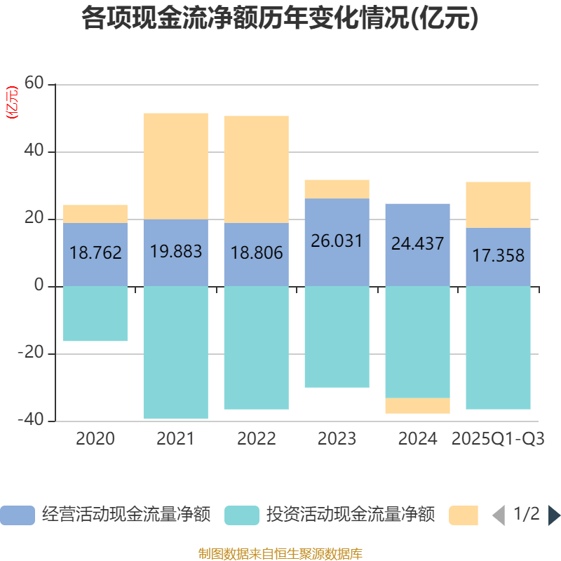 2025年前三季度,公司经营活动现金流净额为17.36亿元,同比增长4.67%;筹资活动现金流净额13.57亿元,同比增加8.59亿元;投资活动现金流净额-36.6亿元,上年同期为-30.72亿元。