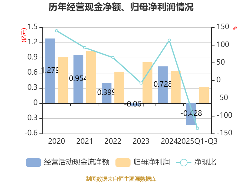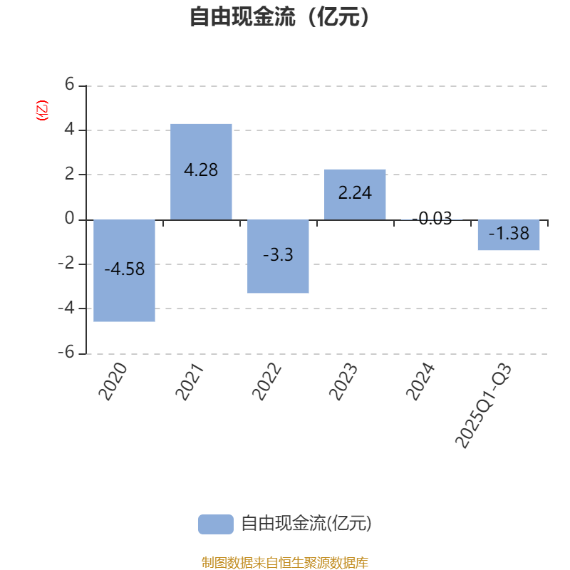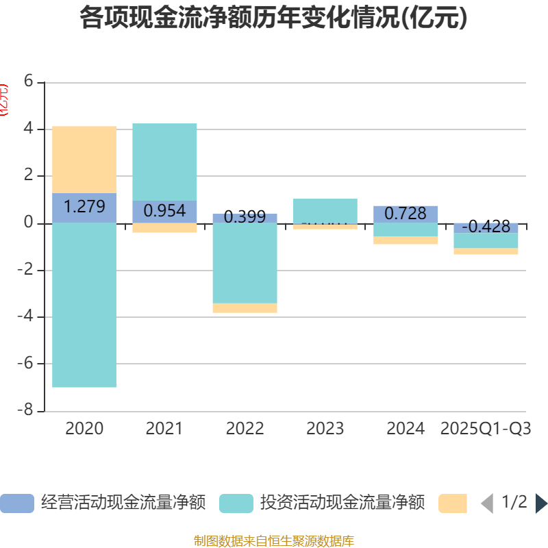 2025年前三季度,公司经营活动现金流净额为-4278.91万元,同比增加4366.52万元;筹资活动现金流净额-2600.07万元,同比增加612.61万元;投资活动现金流净额-6455.19万元,上年同期为-4045.11万元。