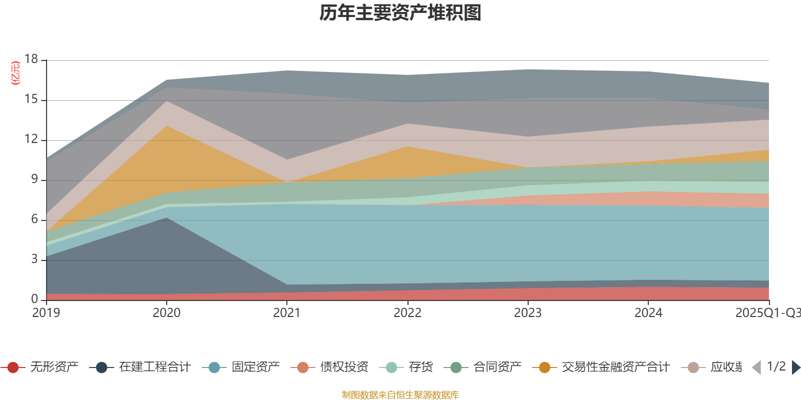 资产重大变化方面,截至2025年三季度末,公司货币资金较上年末减少64.5%,占公司总资产比重下降7.77个百分点;交易性金融资产合计较上年末增加325.01%,占公司总资产比重上升4.06个百分点;合同资产较上年末增加24.32%,占公司总资产比重上升2.25个百分点;应收票据及应收账款较上年末减少13.49%,占公司总资产比重下降1.37个百分点。