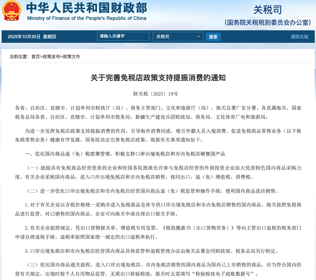 据财政部10月30日消息,近日,财政部、商务部、文化和旅游部、海关总署、税务总局联合印发《关于完善免税店政策支持提振消费的通知》(以下简称《通知》),明确自2025年11月1日起完善免税店政策,旨在进一步发挥免税店政策支持提振消费的作用,引导海外消费回流,吸引外籍人员入境消费,促进免税商品零售业务健康有序发展。