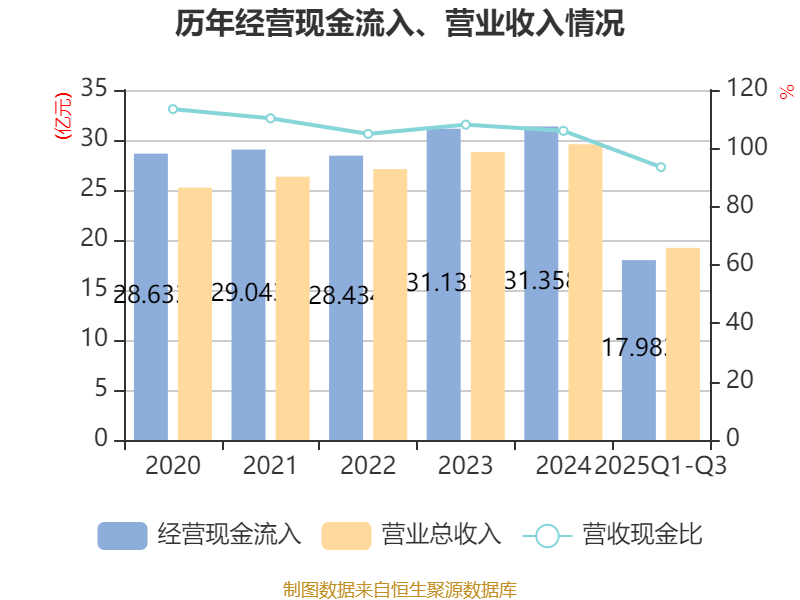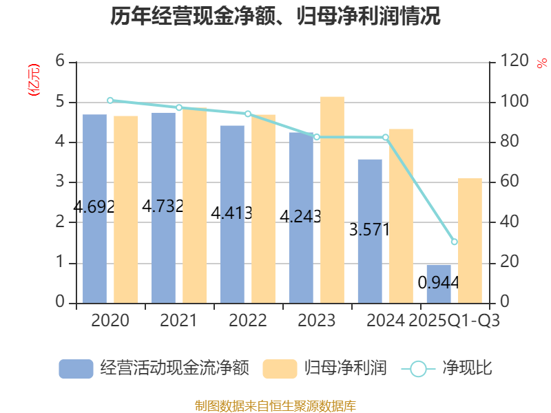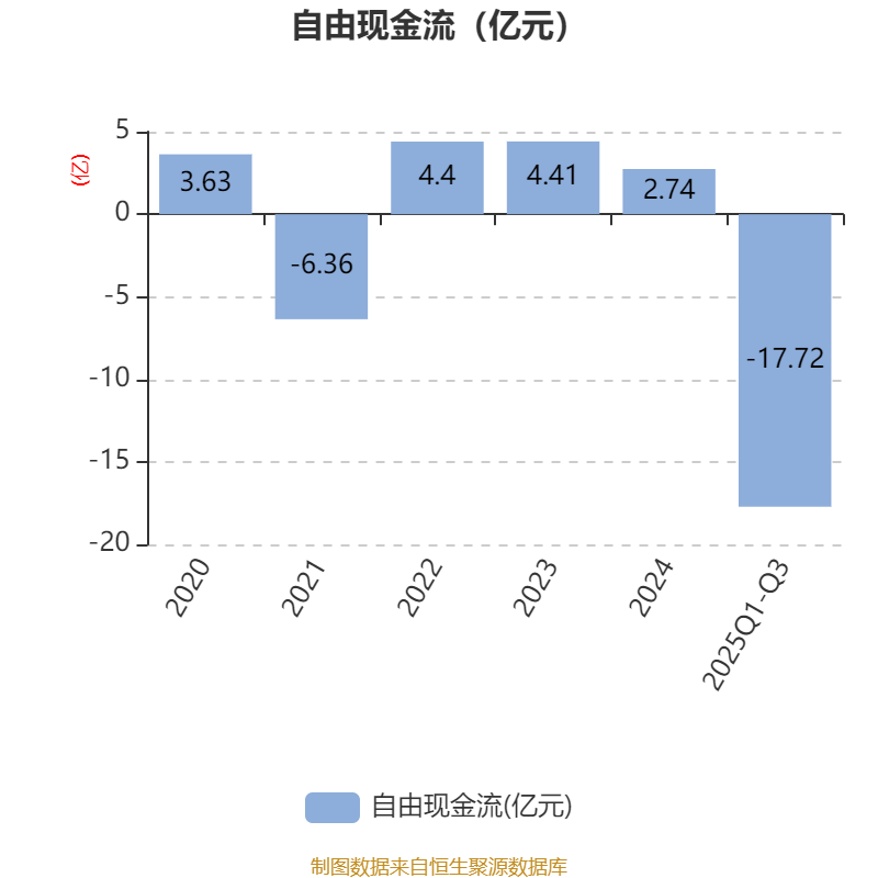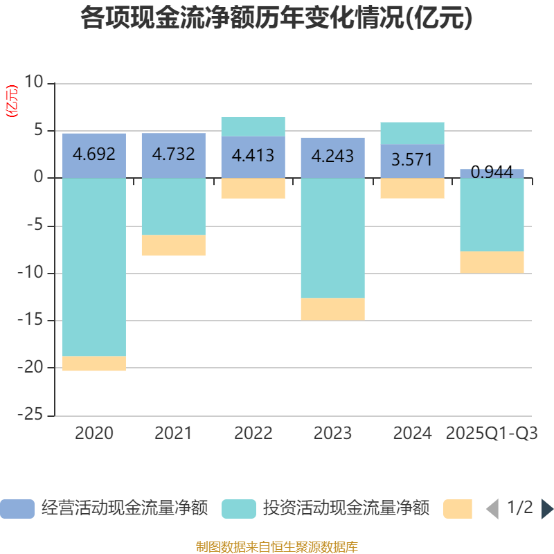 2025年前三季度,公司经营活动现金流净额为9444.05万元,同比增长129.19%;筹资活动现金流净额-2.28亿元,同比减少1376.31万元;投资活动现金流净额-7.72亿元,上年同期为-4.79亿元。