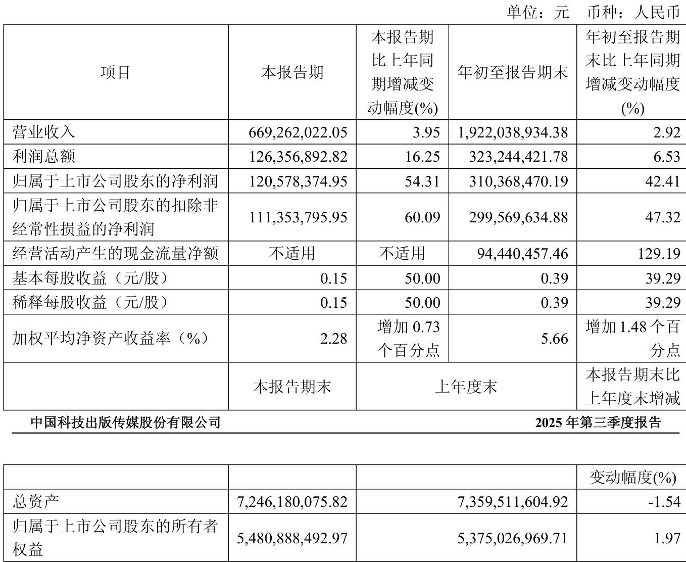 中证智能财讯中国科传(601858)10月31日披露2025年第三季度报告。前三季度公司实现营业总收入19.22亿元,同比增长2.92%;归母净利润3.1亿元,同比增长42.41%;扣非净利润3亿元,同比增长47.32%;经营活动产生的现金流量净额为9444.05万元,同比增长129.19%;报告期内,中国科传基本每股收益为0.39元,加权平均净资产收益率为5.66%。