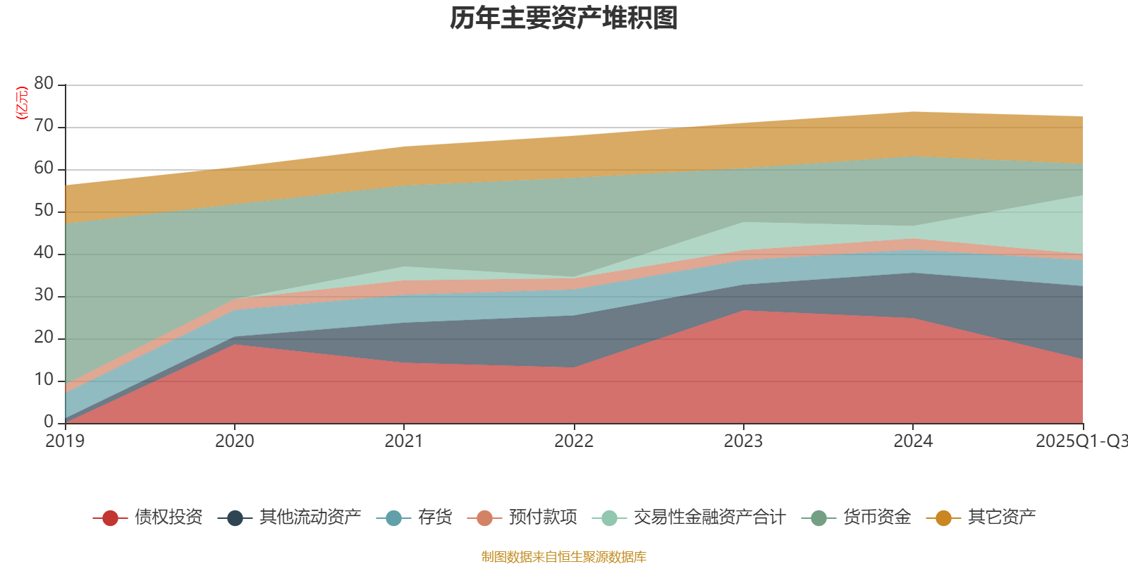 资产重大变化方面,截至2025年三季度末,公司交易性金融资产合计较上年末增加364.06%,占公司总资产比重上升15.05个百分点;债权投资较上年末减少39.15%,占公司总资产比重下降12.87个百分点;货币资金较上年末减少54.56%,占公司总资产比重下降12.03个百分点;其他流动资产较上年末增加61.31%,占公司总资产比重上升9.3个百分点。