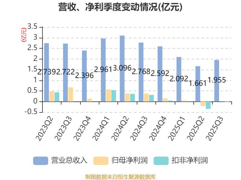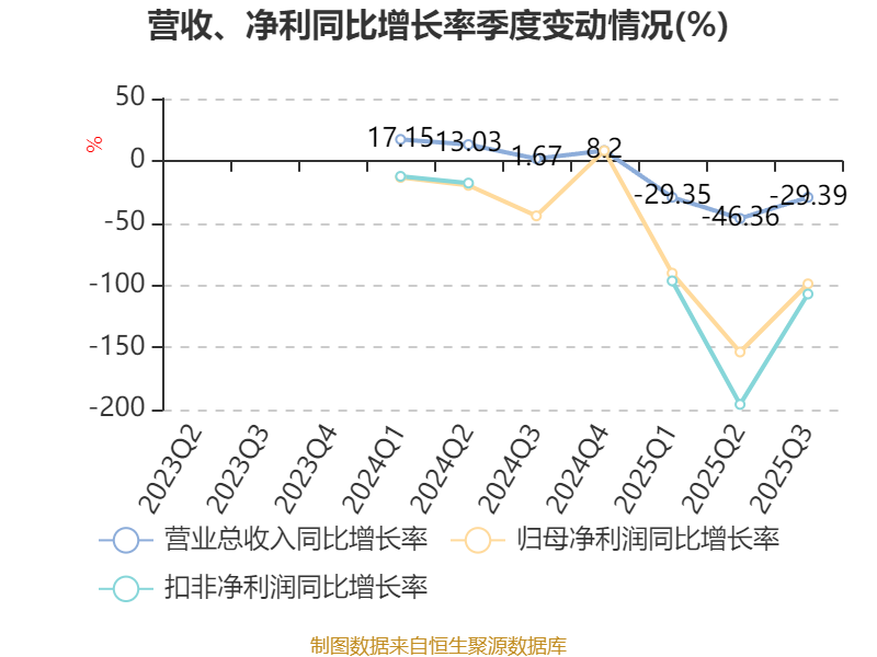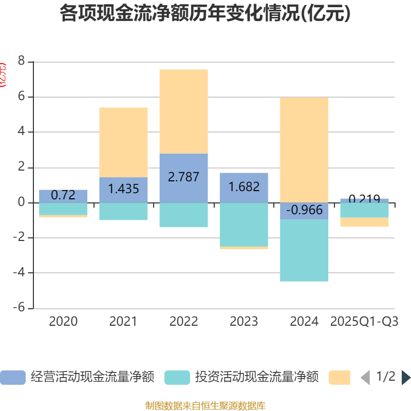 2025年前三季度,公司经营活动现金流净额为2193.58万元,同比增加1.21亿元;筹资活动现金流净额-5117.91万元,同比减少6.64亿元;投资活动现金流净额-8572.24万元,上年同期为-1.87亿元。