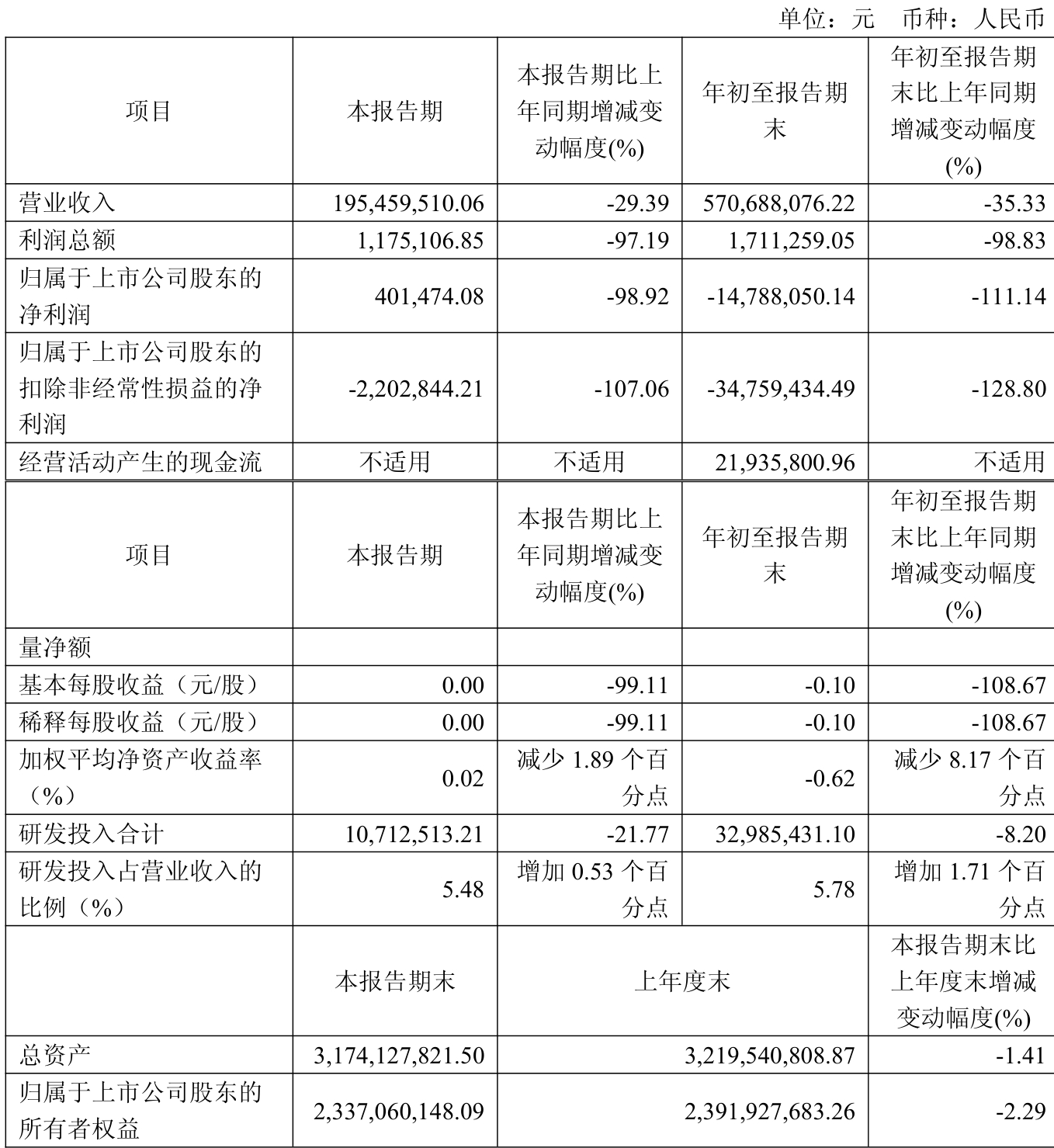 中证智能财讯益诺思(688710)10月31日披露2025年第三季度报告。前三季度公司实现营业总收入5.71亿元,同比下降35.33%;归母净利润亏损1478.81万元,上年同期盈利1.33亿元;扣非净利润亏损3475.94万元,上年同期盈利1.21亿元;经营活动产生的现金流量净额为2193.58万元,上年同期为-9931.21万元;报告期内,益诺思基本每股收益为-0.1元,加权平均净资产收益率为-0.62%。
