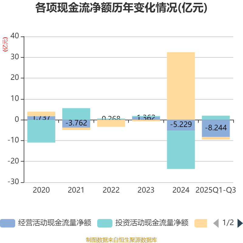 2025年前三季度,公司经营活动现金流净额为-8.24亿元,同比减少3.7亿元;筹资活动现金流净额-1.28亿元,同比减少33.09亿元;投资活动现金流净额1.95亿元,上年同期为-11.15亿元。
