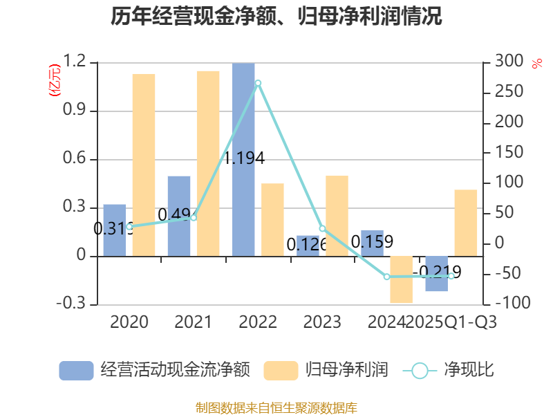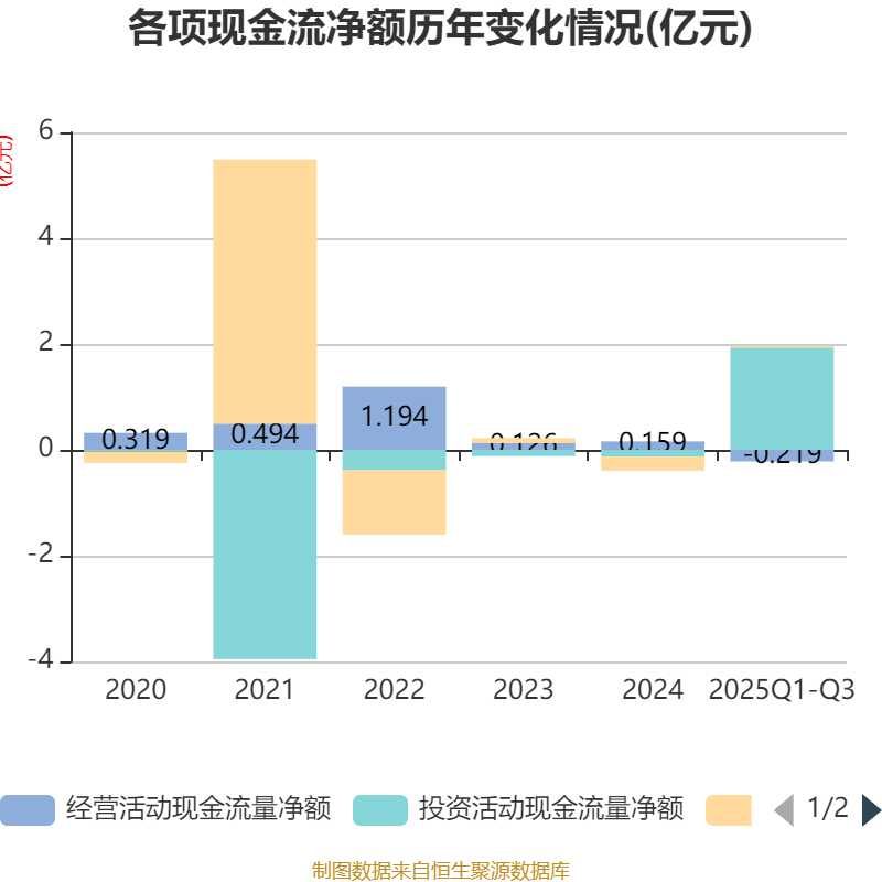 2025年前三季度,公司经营活动现金流净额为-2185.02万元,同比减少2965.85万元;筹资活动现金流净额247.23万元,同比增加2935.45万元;投资活动现金流净额1.93亿元,上年同期为3360.42万元。